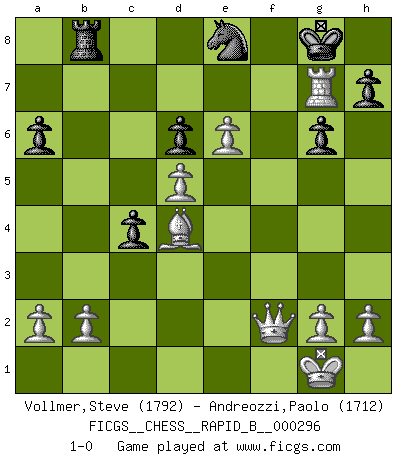 Last move : 1-0 2018 November 12 17:18:17 [Event "FICGS__CHESS__RAPID_B__000296"] [Site "FICGS"] [Date "2018.09.26"] [Round "1"] [White "Vollmer,Steve"] [Black "Andreozzi,Paolo"] [Result "1-0"] [WhiteElo "1792"] [BlackElo "1712"] 1.e4 d5 2.exd5 Nf6 3.c4 g6 4.Nf3 Bg7 5.d4 Bg4 6.Be2 O-O 7.O-O Nbd7 8.Nc3 a6 9.Be3 Nb6 10.Ne5 Bxe2 11.Qxe2 Nbd7 12.f4 Nb6 13.f5 e6 14.dxe6 fxe6 15.fxe6 Ne8 16.Rxf8+ Bxf8 17.Rf1 Bg7 18.Nf7 Qe7 19.d5 Nc8 20.Ne4 Ncd6 21.Nexd6 Qxd6 22.Nxd6 cxd6 23.Rf7 b5 24.Qf2 bxc4 25.Bd4 Rb8 26.Rxg7+ 1-0 Scandinavian defense Kingside Castling by player Black (move 6) Kingside Castling by player White (move 7) Player White won this chess game. Follow this game move after move (download)Strategy requires thought, tactics require observation. (Max Euwe) Immer nach dem besten Zug zu suchen ist ziemlich unpraktisch. (Nigel Short) Un buen sacrificio es aquel que aunque no sea necesariamente sólido, deja a tu oponente aturdido y confuso. (Rudolph Spielmann) La tactique est l'élément le plus important du milieu de jeu. (Siegbert Tarrasch) What doesn't kill us makes us stronger. (Friedrich Nietzsche)