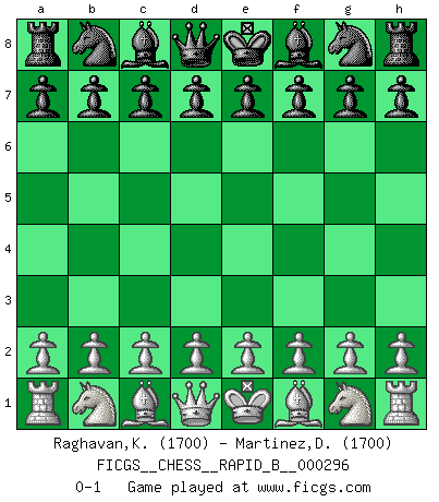 Last move : 0-1 2018 October 27 10:0:33 [Event "FICGS__CHESS__RAPID_B__000296"] [Site "FICGS"] [Date "2018.09.26"] [Round "1"] [White "Raghavan,Krisnamurthy"] [Black "Martinez,Dieggo"] [Result "0-1"] [WhiteElo "1700"] [BlackElo "1700"] 0-1 This chess game has been lost on time (started : 2018.09.26 22:51:13) Player Black won this chess game. Follow this game move after move (download)The boy (then a 12 year old boy named Anatoly Karpov) doesn't have a clue about Chess, and there's no future at all for him in this profession. (Mikhail Botvinnik) Bis jetzt ist Weiß einer wohlbekannten Analyse gefolgt. Aber jetzt begeht er einen schrecklichen Fehler: Er beginnt seinen eigenen Kopf zu benutzen. (Siegbert Tarrasch) El Ajedrez es el arte del análisis. (Mikhail Botvinnik) Toutes choses étant égales, c'est la conviction qui gagne. Alliée à une volonté de vaincre, elle sert de détonateur, suscite des idées, disperse les doutes et aide à penser clairement. (Robert Fischer) May the force be with you. (Han Solo in Star Wars ep.4)