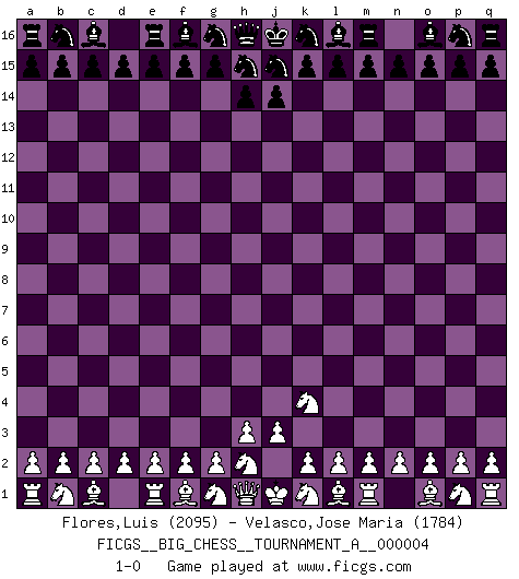Last move : 1-0 2018 October 27 22:6:4 [Event "FICGS__BIG_CHESS__TOURNAMENT_A__000004"] [Site "FICGS"] [Date "2018.09.26"] [Round "1"] [White "Flores,Luis"] [Black "Velasco,Jose Maria"] [Result "1-0"] [WhiteElo "2095"] [BlackElo "1784"] 1.j2-k4 1-0 This big chess game has been lost on time (started : 2018.09.26 22:51:54) Follow this game move after move (download)The hallmark of the artist is simplicity. (Larry Evans) Ein Gewinn durch eine ungenaue Kombination, sei sie auch noch so vorzeigbar, erfüllt mich mit Schaudern. (Wilhelm Steinitz) Evita las multitudes. Haz independientemente tu propio razonamiento. Trata de ser el jugador de Ajedrez, no la pieza de Ajedrez. (Ralph Charell) La vérité est comme le meilleur coup aux échecs : elle existe, mais il faut la chercher. (Arturo Perez-Reverte) Life is the sum of all your choices. (Albert Camus)