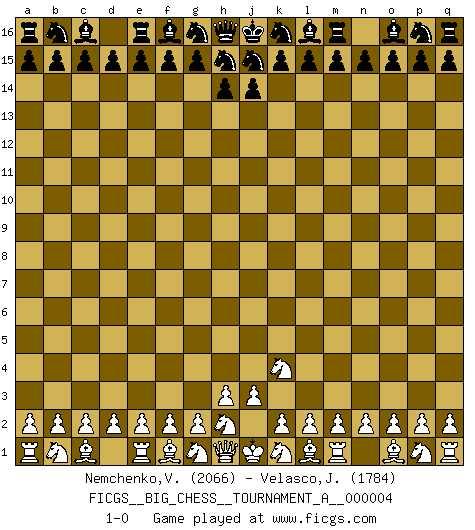 Last move : 1-0 2018 October 27 10:0:33 [Event "FICGS__BIG_CHESS__TOURNAMENT_A__000004"] [Site "FICGS"] [Date "2018.09.26"] [Round "1"] [White "Nemchenko,Valery"] [Black "Velasco,Jose Maria"] [Result "1-0"] [WhiteElo "2066"] [BlackElo "1784"] 1.j2-k4 1-0 This big chess game has been lost on time (started : 2018.09.26 22:51:54) Follow this game move after move (download)The game of chess is the touchstone of the intellect. (Goethe) Die Elozahlen sind sehr schlecht für das Schach. Jetzt ist Schach eine Sportindustrie, die darauf zielt Elopunkte zu machen. (Miguel Najdorf) No soy una persona materialista y por eso, no resiento la falta o pérdida del dinero. La ausencia de cosas mundanas carece de importancia. Ya que el Ajedrez es una forma en la que puedo ser tan materialista como yo desee sin tener la necesidad de vender mi alma. (Jamie Walter Adams) Pour se monter efficace, un Cavalier a besoin d'avant-postes ! Les Cavaliers font les meilleurs bloqueurs de pions passés. Lottery : A tax on people who are bad at math. (Author unknown)