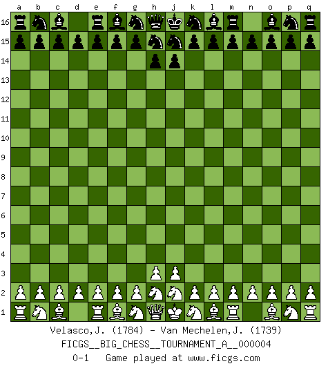 Last move : 0-1 2018 October 27 10:0:33 [Event "FICGS__BIG_CHESS__TOURNAMENT_A__000004"] [Site "FICGS"] [Date "2018.09.26"] [Round "1"] [White "Velasco,Jose Maria"] [Black "Van Mechelen,Jan"] [Result "0-1"] [WhiteElo "1784"] [BlackElo "1739"] 0-1 This big chess game has been lost on time (started : 2018.09.26 22:51:54) Follow this game move after move (download)I look one move ahead... the best ! (Siegbert Tarrasch) Über Frauen: Chess is better. (Robert James Fischer) Las leyes del Ajedrez no permiten una libre elección: tienes que mover quieras o no. (Emanuel Lasker) Les réformistes prétendent que les progrès de la théorie conduiront à la disparition des échecs, et qu'il faut, pour leur rendre vie, en remanier les règles. En réalité, qu'exprime cette affirmation? Le mépris de l'intuition, de l'imagination et de tous les autres éléments qui font des échecs un art. (Alexander Alekhine) Heh, heh, heh. Time to abandon ship. (General Grievous in Star Wars ep.3)