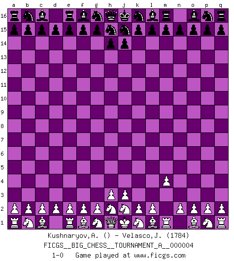 Last move : 1-0 2018 October 27 10:0:33 [Event "FICGS__BIG_CHESS__TOURNAMENT_A__000004"] [Site "FICGS"] [Date "2018.09.26"] [Round "1"] [White "Kushnaryov,Andrey"] [Black "Velasco,Jose Maria"] [Result "1-0"] [WhiteElo ""] [BlackElo "1784"] 1.m2-m4 1-0 This big chess game has been lost on time (started : 2018.09.26 22:51:54) Follow this game move after move (download)Alekhine is a poet who creates a work of art out of something that would hardly inspire another man to send home a picture post card. (Max Euwe) Rauchen ist dem Schachspieler bei seiner Arbeit, also im Wettkampf, untersagt. (Viktor Kortschnoi) Fischer es una tragedia del Ajedrez Americano a la par con Morphy y Pillsbury. (Mig Greengard) Dieu déplace le joueur, et celui-ci la pièce. Quel Dieu derrière Dieu commence donc la trame ? Arturo Perez-Reverte (prix de littérature policière 1993). Control your own destiny or someone else will. (Jack Welch)