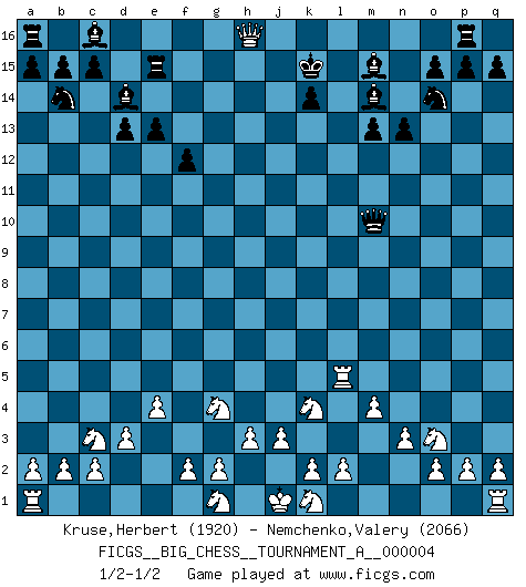 Last move : 1/2-1/2 2018 November 5 18:47:51 [Event "FICGS__BIG_CHESS__TOURNAMENT_A__000004"] [Site "FICGS"] [Date "2018.09.26"] [Round "1"] [White "Kruse,Herbert"] [Black "Nemchenko,Valery"] [Result "1/2-1/2"] [WhiteElo "1920"] [BlackElo "2066"] 1.m2-m4 m15-m13 2.p1-o3 j15-k13 3.b1-c3 g15-g13 4.j2-k4 p16-o14 5.e2-e4 e15-e13 6.f1-b5 g16-j15 7.l1-o4 d15-d13 8.d2-d3 n15-n13 9.c1-k8 b16-d15 10.n2-n3 f15-f14 11.o1-f9 l16-m15 12.h1-m5 d15-b14 13.m1-m3 k16-l14 14.m3-l3 o16-m14 15.e1-e3 f16-d14 16.l3-l5 f14-f13 17.e3-f3 f13-f12 18.f3-f6 h15-f14 19.f6-j6 j16-h15 20.m5-p8 q16-p16 21.f9-k13 j15-k13 22.b5-k13 j14-k13 23.p8-k13 h15-g14 24.k13-k15 e16-e15 25.k15-k11 g14-g15 26.k8-m10 m16-j16 27.j6-h6 j16-j14 28.o4-q6 f14-g12 29.k11-h13 l14-k16 30.h13-g13 g15-h15 31.m10-h14 g12-h14 32.q6-h14 h15-j16 33.h14-m10 k16-h15 34.g13-h13 j14-j15 35.m10-h14 h15-k14 36.h13-g14 j16-k15 37.h14-j15 h16-h6 38.j15-k14 l15-k14 39.h2-g4 h6-m10 40.g14-h13 k15-k16 41.h13-h16 k16-k15 42.h16-h13 k15-k16 43.h13-h16 k16-k15 1/2-1/2 Follow this game move after move (download)I like to say that Bobby Fischer was the greatest player ever. But what made Fischer a genius was his ability to blend an American freshness and pragmatism with Russian ideas about strategy. (Bruce Pandolfini) Obwohl ich vom Stil her kaum zu den Priestern der Schachkunst gezählt werde, halte ich Schach doch für eine Kunst. (Tigran Petrosjan) Nunca nadie ha ganado una partida de Ajedrez rindiendose. (Unknown) Des idées, des idées, j'en ai cent, j'en ai mille. Des bonnes, des mauvaises, applicables, irréalisables... Il suffit de faire le tri ! (Roos) Creativity is allowing yourself to make mistakes. Art is knowing which ones to keep. (Scott Adams)