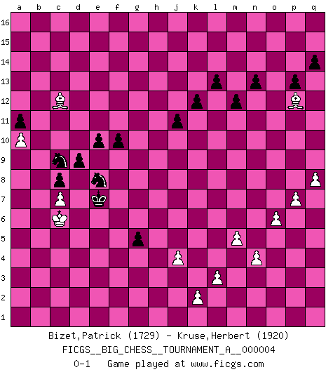 Last move : 0-1 2018 December 28 21:8:24 [Event "FICGS__BIG_CHESS__TOURNAMENT_A__000004"] [Site "FICGS"] [Date "2018.09.27"] [Round "1"] [White "Bizet,Patrick"] [Black "Kruse,Herbert"] [Result "0-1"] [WhiteElo "1729"] [BlackElo "1920"] 1.p1-o3 p16-o14 2.b1-c3 b16-c14 3.j2-h4 m15-m13 4.h2-j4 j15-k13 5.m2-m4 h15-g13 6.e2-e4 e15-e13 7.f1-b5 l16-p12 8.h1-p8 h16-l13 9.k1-l3 g16-j15 10.d2-d4 f16-b12 11.n2-n4 d15-d14 12.g1-f3 c16-l8 13.o1-k5 k16-h15 14.c1-g5 n15-n14 15.m4-m5 l13-b4 16.g5-c1 o16-g9 17.o3-m4 b12-c13 18.l1-n3 e16-e14 19.a2-a3 b4-a5 20.c1-g5 e14-f14 21.q1-n1 m16-m14 22.m4-o5 l8-n10 23.p8-c8 a5-a9 24.j1-j2 f14-f8 25.c8-c9 a9-c9 26.g5-c9 g9-n3 27.o5-n3 m14-l14 28.c9-d10 f8-d8 29.d10-j5 l14-l9 30.j5-k6 c13-k6 31.j4-k6 a16-e16 32.m1-m4 e16-e14 33.m4-l4 l9-g9 34.n3-o5 e14-f14 35.n1-n3 n10-f3 36.g2-f3 d8-d4 37.a1-d1 d4-d1 38.e1-d1 p12-f3 39.h4-f3 f14-f3 40.b5-d3 f3-f2 41.j2-k3 g9-p9 42.p2-p3 q16-m16 43.n3-n1 f2-f6 44.k6-h5 f6-h6 45.j3-j4 m16-m14 46.l4-l6 h6-l6 47.k5-l6 m14-k14 48.l3-k5 k13-j11 49.n1-g1 k14-k10 50.g1-g7 k10-b10 51.b2-b3 c14-d12 52.c3-d5 b15-b14 53.d1-f1 j15-k13 54.f1-f7 h15-k14 55.g7-p7 b10-b9 56.p7-p9 b9-p9 57.f7-p7 p9-p7 58.o5-p7 k13-l11 59.q2-q4 j16-j15 60.k3-k4 l15-l13 61.d5-f6 k14-j12 62.h5-j7 k15-k13 63.f6-g8 f15-f13 64.p7-o9 j12-k10 65.k5-l7 j15-k14 66.o9-m8 j14-j13 67.m8-k9 j11-k9 68.l7-k9 l11-k9 69.j7-k9 g13-j12 70.g8-h10 j12-h10 71.k9-h10 j13-j12 72.d3-a6 g15-g14 73.h10-f11 d12-f11 74.l6-f11 h14-h13 75.k4-j5 e13-e12 76.f11-k7 b14-b13 77.a6-c8 c15-c13 78.c8-a10 c13-c12 79.p3-p4 d14-d13 80.o2-o4 g14-g13 81.q4-q5 g13-g12 82.p4-p5 f13-f12 83.j5-h6 k14-j13 84.h6-g7 j13-h12 85.g7-f8 h12-g11 86.f8-e9 b13-b12 87.a10-b9 a15-a13 88.c2-c4 o14-n12 89.e9-d9 f12-f11 90.c4-c5 n12-l11 91.b9-f5 p15-p14 92.b3-b4 l11-j10 93.c5-c6 j10-h8 94.k7-h5 d13-d12 95.c6-c7 d12-d11 96.d9-d10 g11-f10 97.h5-a12 h8-f9 98.d10-c9 h13-h12 99.a12-d15 g12-g11 100.d15-f13 e12-e11 101.f13-h15 k13-k12 102.h15-k13 n14-n13 103.k13-n16 o15-o13 104.n16-o15 m13-m12 105.o15-p16 q15-q14 106.p16-q15 p14-p13 107.q15-o13 c12-c11 108.b4-b5 b12-b11 109.b5-b6 f9-d10 110.b6-b7 b11-b10 111.c9-d8 d10-f9 112.d8-d7 a13-a12 113.a3-a4 a12-a11 114.a4-a5 j12-j11 115.a5-a6 g11-g10 116.a6-a7 g10-g9 117.f5-h7 e11-e10 118.a7-a8 h12-h11 119.e4-e5 h11-h10 120.e5-e6 h10-h9 121.e6-e7 g9-g8 122.h7-l10 f10-e9 123.l10-h13 f11-f10 124.h13-g14 d11-d10 125.o13-l16 k10-j8 126.g14-h13 j8-g9 127.h13-f15 g9-e8 128.b7-b8 d10-d9 129.f15-c12 e8-g9 130.q5-q6 c11-c10 131.q6-q7 c10-c9 132.b8-c9 b10-c9 133.p5-p6 c9-c8 134.d7-e6 f9-g7 135.e6-d6 h9-h8 136.l2-l3 g7-e8 137.d6-c6 e8-c9 138.a8-a9 e9-e8 139.c6-d6 e8-f7 140.a9-a10 g8-g7 141.o4-o5 h8-h7 142.p6-p7 h7-h6 143.o5-o6 f7-f6 144.h3-h4 g7-g6 145.q7-q8 g6-g5 146.h4-g5 h6-g5 147.l16-p12 g9-e8 148.d6-c6 f6-e7 0-1 Follow this game move after move (download)A big shock; the best chess player in history has passed away. (Lajos Portisch, about Bobby Fischer's death) Privat ist Kortschnoi kein schlechter Mensch, sehr sympathisch. Aber während des Spiels ist er grausam. Er will dich töten. (Miguel Najdorf) Una compensación adecuada por un sacrificio es tener una combinación sólida que conduce a una posición ganadora; una compensación adecuada por una metida de pata es dejar a tu oponente arrebatar una derrota de las fauces de la victoria. (Bruce A. Moon) Les échecs, c'est l'art d'analyser. (Mikhail Botvinnik) Every man's memory is his private literature. (Aldous Huxley)