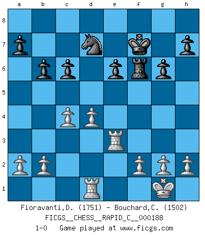 Last move : 1-0 2018 December 8 12:47:32 [Event "FICGS__CHESS__RAPID_C__000188"] [Site "FICGS"] [Date "2018.09.27"] [Round "1"] [White "Fioravanti,Diego"] [Black "Bouchard,Carl-Felix"] [Result "1-0"] [WhiteElo "1751"] [BlackElo "1502"] 1.d4 Nf6 2.c4 e6 3.Nc3 g6 4.e4 d5 5.e5 Ne4 6.Nxe4 dxe4 7.Ne2 Bg7 8.Nc3 O-O 9.Nxe4 b6 10.Bg5 f6 11.exf6 Bxf6 12.Nxf6+ Rxf6 13.Bxf6 Qxf6 14.Be2 Bb7 15.O-O Nd7 16.Bf3 Bxf3 17.Qxf3 Rf8 18.Qxf6 Rxf6 19.Rad1 c6 20.Rfe1 Kf7 21.Re3 1-0 This chess game has been lost on time (started : 2018.09.27 2:50:43) Queen's pawn game Kingside Castling by player Black (move 8) Kingside Castling by player White (move 15) Player White won this chess game. Follow this game move after move (download)Bobby just drops the pieces and they fall on the right squares. (Miguel Najdorf) Frage: Was machen Sie mit den Preisen? Anwort: Ich habe Angst, dass meine Freundin davon neue Kleider kauft. (Loek van Wely) Aunque la mayoría de la gente disfruta observar las partidas de los grandes Maestros de ataque, algunos de los jugadores mas notables en la historia han sido los jugadores silenciosos posicionales. Lentamente ellos te aplastan despojandote de tu espacio, congestionando tus piezas y dejandote virtualmente sin nada que hacer. (Yasser Seirawan) Plusieurs personnes se sont demandées comment Tal faisait pour gagner... En fait, c'est très simple ! Il met ses pièces au centre de l'échiquier et les sacrifie quelque part ! (David Bronstein) To err is human, but to really foul things up requires a computer. (Farmer's Almanac, 1978)