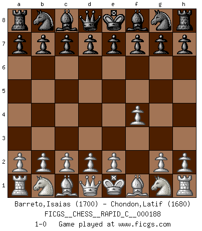 Last move : 1-0 2018 October 27 10:0:33 [Event "FICGS__CHESS__RAPID_C__000188"] [Site "FICGS"] [Date "2018.09.27"] [Round "1"] [White "Barreto,Isaias"] [Black "Chondon,Latif"] [Result "1-0"] [WhiteElo "1700"] [BlackElo "1680"] 1.f4 1-0 This chess game has been lost on time (started : 2018.09.27 2:50:43) Bird's Opening Player White won this chess game. Follow this game move after move (download)Every Chess master was once a beginner. (Chernev) Ein Gewinn durch eine ungenaue Kombination, sei sie auch noch so vorzeigbar, erfüllt mich mit Schaudern. (Wilhelm Steinitz) No solamente yo pronostico su triunfo sobre Botvinnik, sino que me adelanto y digo que probablemente Fischer es el jugador de Ajedrez mas grande que haya existido. (John Collins) Celui qui prend des risques peut perdre, celui qui n'en prend pas perd toujours. (Xavier Tartacover) It is a good thing for an uneducated man to read books of quotations. (Winston Churchill)