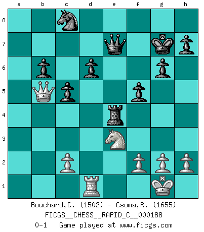 Last move : 0-1 2018 December 19 2:15:51 [Event "FICGS__CHESS__RAPID_C__000188"] [Site "FICGS"] [Date "2018.09.27"] [Round "1"] [White "Bouchard,Carl-Felix"] [Black "Csoma,Robert"] [Result "0-1"] [WhiteElo "1502"] [BlackElo "1655"] 1.e4 d6 2.d4 Nf6 3.Nc3 g6 4.Nf3 Bg7 5.Be2 O-O 6.O-O a6 7.a4 b6 8.b4 Bb7 9.Bd3 Nc6 10.b5 axb5 11.Bxb5 Na7 12.Bd3 c5 13.d5 e6 14.Bc4 exd5 15.exd5 Nc8 16.Re1 Ba6 17.Bxa6 Rxa6 18.Bb2 Re8 19.Nb5 Rxe1+ 20.Qxe1 Nxd5 21.Bxg7 Kxg7 22.Rd1 Nc7 23.Qe2 Rxa4 24.Ne5 Nxb5 25.Qxb5 Re4 26.Nc4 Qe7 27.Ne3 f5 0-1 This chess game has been lost on time (started : 2018.09.27 2:50:43) Pirc : Classical system, 5.Be2 Kingside Castling by player Black (move 5) Kingside Castling by player White (move 6) Player Black won this chess game. Follow this game move after move (download)You sit at the board and suddenly your heart leaps. Your hand trembles to pick up the piece and move it. But what Chess teaches you is that you must sit there calmly and think about whether it's really a good idea and whether there are other better ideas. (Stanley Kubrick) Taktik ist was man tun muß, wenn etwas zu tun ist. Strategie ist was man tun muß, wenn nichts zu tun ist. (Savielly Grigorievitsch Tartakower) Desconfianza es la característica mas necesaria de un jugador de Ajedrez. (Siegbert Tarrasch) Les Echecs, c'est l'art de la guerre sans les charniers, c'est la résurrection des morts tombés au champ d'honneur, l'espoir perpétuel, la suprématie de l'intelligence sur la force, la culture de l'esprit. (F. Szpiner) Life is like internet, nothing interesting, but noone want to leave it. (Ilmars Cirulis)
