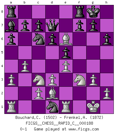 Last move : 0-1 2018 October 10 0:26:29 [Event "FICGS__CHESS__RAPID_C__000188"] [Site "FICGS"] [Date "2018.09.27"] [Round "1"] [White "Bouchard,Carl-Felix"] [Black "Frenkel,Alex"] [Result "0-1"] [WhiteElo "1502"] [BlackElo "1872"] 1.e4 e5 2.Nf3 Nc6 3.d3 Bc5 4.g3 Nf6 5.Bg2 d6 6.Bg5 h6 7.Bd2 O-O 8.O-O Be6 9.Nc3 a6 10.a3 Qd7 11.b4 Ba7 12.Re1 Ng4 13.Bh3 Nxf2 14.Bxe6 Nxd1 0-1 King's pawn game Kingside Castling by player Black (move 7) Kingside Castling by player White (move 8) Player Black won this chess game. Follow this game move after move (download)In order to improve your game, you must study the endgame before everything else, for whereas the endings can be studied and mastered by themselves, the middle game and the opening must be studied in relation to the endgame. (Jose Raul Capablanca) Ohne Fehler kann es keine Brillanz geben. (Emanuel Lasker) Aunque la mayoría de la gente disfruta observar las partidas de los grandes Maestros de ataque, algunos de los jugadores mas notables en la historia han sido los jugadores silenciosos posicionales. Lentamente ellos te aplastan despojandote de tu espacio, congestionando tus piezas y dejandote virtualmente sin nada que hacer. (Yasser Seirawan) Il n'y a plus de joueurs du niveau de Jacob Murray dont la seule quête est le beau jeu, le plaisir de voir les pièces construire quelque chose. Sur 10 idées à la minute, 9 seront sans intérêt, la dernière s'avèrera géniale. (Christian Bauer) Luck never gives; it only lends. (Swedish proverb)