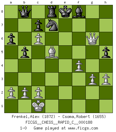 Last move : 1-0 2018 October 26 23:11:3 [Event "FICGS__CHESS__RAPID_C__000188"] [Site "FICGS"] [Date "2018.09.27"] [Round "1"] [White "Frenkel,Alex"] [Black "Csoma,Robert"] [Result "1-0"] [WhiteElo "1872"] [BlackElo "1655"] 1.e4 d6 2.d4 Nf6 3.Nc3 g6 4.Bg5 Bg7 5.Qd2 h5 6.O-O-O Nbd7 7.h3 Nf8 8.Nf3 Ne6 9.Be3 a6 10.d5 Nf8 11.g3 b5 12.Bg2 N8d7 13.Nd4 Bb7 14.f4 Nc5 15.Nc6 Bxc6 16.dxc6 O-O 17.Bxc5 dxc5 18.Qf2 Qe8 19.e5 Nh7 20.Nd5 Rc8 21.Qxc5 Kh8 22.Nxe7 Rd8 23.Rxd8 Qxd8 24.Rd1 Qb8 25.Rd7 Rd8 26.e6 Nf6 27.exf7 Nxd7 28.Nxg6+ Kh7 29.Nf8+ Bxf8 30.Be4+ Kg7 31.Qg5+ Kxf7 32.Bd5+ Ke8 33.Qg6+ 1-0 Pirc : Byrne variation Queenside Castling by player White (move 6) Kingside Castling by player Black (move 16) Player White won this chess game. Follow this game move after move (download)Fischer sacrificed virtually everything most of us weakies (to use his term) value, respect, and cherish, for the sake of an artful, often beautiful board game, for the ambivalent privilege of being its greatest master. (Paul Kollar) Mit sehr nachdenklichem Gesicht schreitet Bobby durch den Turniersaal. Was ist passiert?, fragt Lombardy. Ich stehe schlecht, antwortet Fischer. Lombardy: Dann biete doch einfach Remis an. Fischer: So schlecht stehe ich nun auch wieder nicht! (Robert James Fischer) No volvere nunca a jugar contigo. Has insultado a mi amigo. - cuando un oponente se maldijo por una mala jugada (Miguel Najdorf) La vie est comme un jeu d'échecs : nous esquissons un plan, mais celui-ci est tributaire de ce que daignent faire l'adversaire aux échecs et le destin dans la vie. (Arthur Schopenhauer) Over-the-board chess is the favorite of mortals, correspondence chess is the favorite of the gods. (Eduard Dyckhoff)
