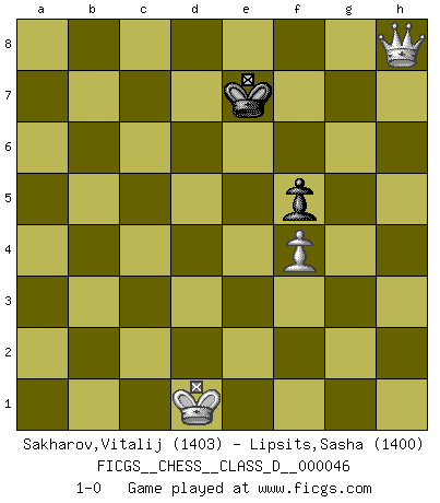 Last move : 1-0 2007 June 12 23:47:27 [Event "FICGS__CHESS__CLASS_D__000046"] [Site "FICGS"] [Date "2007.05.19"] [Round "1"] [White "Sakharov,Vitalij"] [Black "Lipsits,Sasha"] [Result "1-0"] [WhiteElo "1403"] [BlackElo "1400"] 1.e4 c5 2.Nf3 d6 3.Bb5+ Bd7 4.Bxd7+ Qxd7 5.O-O Nc6 6.b3 Nf6 7.d3 O-O-O 8.a4 e5 9.a5 d5 10.exd5 Nxd5 11.a6 b6 12.Re1 Bd6 13.Na3 Ncb4 14.Nxe5 Bxe5 15.Rxe5 Nxa6 16.Nc4 Nab4 17.Bb2 f6 18.Re1 Qf7 19.d4 cxd4 20.Bxd4 Nc6 21.g3 Nde7 22.c3 Nf5 23.Qg4 g6 24.Qe4 Kb7 25.g4 Nfxd4 26.cxd4 Rxd4 27.Qxd4 Nxd4 28.Nd6+ Kb8 29.Nxf7 Rf8 30.Nd6 Nf3+ 31.Kg2 Nxe1+ 32.Rxe1 h5 33.gxh5 gxh5 34.Re8+ Rxe8 35.Nxe8 f5 36.Ng7 Kc7 37.Nxh5 Kd6 38.Ng3 Ke5 39.Kf3 a5 40.Ke2 b5 41.Nf1 a4 42.bxa4 bxa4 43.Nd2 Kd4 44.f4 Kc3 45.Kd1 a3 46.Nb1+ Kb2 47.Nxa3 Kxa3 48.h4 Kb4 49.h5 Kc5 50.h6 Kd6 51.h7 Ke7 52.h8Q 1-0 Sicilian : Canal-Sokolsky attack, 3...Bd7 Kingside Castling by player White (move 5) Queenside Castling by player Black (move 7) 10 pieces endgame at move 35 : White KNPPP , Black KPPPP WHITE : King + 1 Knight 3 Pawns BLACK : King + 4 Pawns 9 pieces endgame at move 37 : White KNPPP , Black KPPP WHITE : King + 1 Knight 3 Pawns BLACK : King + 3 Pawns 8 pieces endgame at move 42 : White KNPPP , Black KPP WHITE : King + 1 Knight 3 Pawns BLACK : King + 2 Pawns 7 pieces endgame at move 42 : White KNPP , Black KPP WHITE : King + 1 Knight 2 Pawns BLACK : King + 2 Pawns 6 pieces endgame at move 47 : White KNPP , Black KP WHITE : King + 1 Knight 2 Pawns BLACK : King + 1 Pawn 5 pieces endgame at move 47 : White KPP , Black KP WHITE : King + 2 Pawns BLACK : King + 1 Pawn Promotion Queen by player White (move 52) Player White won this chess game. Follow this game move after move (download)The hardest game to win is a won game. (Emanuel Lasker) Meine Liebe ist Schach, Schach, Schach. Ich muss jeden Tag Schach spielen, deshalb fühle ich mich so stark. (Miguel Najdorf) El Ajedrez es el juego mas altamente simbólico, pero las agresiones estan por lo tanto aún mas francamente representadas en la partida. Tal vez comenzo como un juego de guerra; Algo como la representación de una batalla en miniatura entre las fuerzas de dos reinos. (Karl Meninger) Votre prénom est 'Tactique', votre deuxième prénom est 'Tactique' et votre nom est 'Tactique'. (Ken Smith) You can think I'm wrong, but that's no reason to quit thinking. (Gregory House, House M.D.)