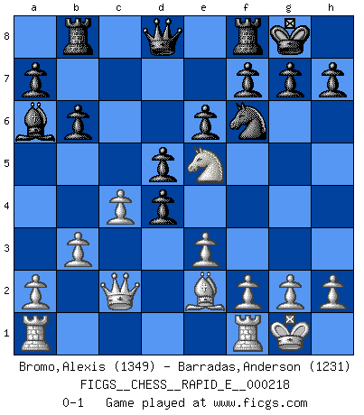Last move : 0-1 2018 December 12 1:22:28 [Event "FICGS__CHESS__RAPID_E__000218"] [Site "FICGS"] [Date "2018.09.27"] [Round "1"] [White "Bromo,Alexis"] [Black "Barradas,Anderson"] [Result "0-1"] [WhiteElo "1349"] [BlackElo "1231"] 1.d4 Nf6 2.c4 d5 3.Nc3 e6 4.Nf3 Bb4 5.Bd2 b6 6.e3 Ba6 7.Nb5 Bxd2+ 8.Qxd2 O-O 9.Be2 Ne4 10.Qc2 c6 11.Nc3 Nxc3 12.Qxc3 Nd7 13.O-O Rb8 14.Qc2 c5 15.b3 Nf6 16.Ne5 cxd4 0-1 This chess game has been lost on time (started : 2018.09.27 3:35:40) Queen's pawn game Kingside Castling by player Black (move 8) Kingside Castling by player White (move 13) Player Black won this chess game. Follow this game move after move (download)Mistrust is the most necessary characteristic of the Chess player. (Siegbert Tarrasch) Ich kenne keine einzige Person, die behaupten würde, Garri Kasparow sei ein guter Mensch (Nigel Short) Prefiero perder una partida realmente buena, que ganar una mala. (David Levy) Le jeu d'échecs est comme rejeté hors du temps. (Antoine de Saint-Exupéry) If you lose the game you should win the analysis! (Proverb)