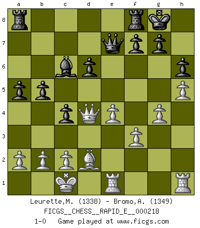 Last move : 1-0 2018 November 15 19:8:24 [Event "FICGS__CHESS__RAPID_E__000218"] [Site "FICGS"] [Date "2018.09.27"] [Round "1"] [White "Leurette,Marc-Antoine"] [Black "Bromo,Alexis"] [Result "1-0"] [WhiteElo "1338"] [BlackElo "1349"] 1.e4 e5 2.Nf3 Nc6 3.Bc4 h6 4.d4 Nf6 5.Nc3 exd4 6.Nxd4 Nxd4 7.Qxd4 c5 8.Qd3 d6 9.Bd2 b6 10.Bd5 Nxd5 11.Nxd5 Bb7 12.O-O-O Be7 13.Nxe7 Qxe7 14.Rde1 O-O 15.f3 b5 16.g4 Bc6 17.h4 a5 18.h5 c4 19.Qd4 1-0 King's pawn game Queenside Castling by player White (move 12) Kingside Castling by player Black (move 14) Player White won this chess game. Follow this game move after move (download)Of all my Russian books, the defense contains and diffuses the greatest 'warmth' which may seem odd seeing how supremely abstract Chess is supposed to be. (Vladimir Nabokov) Ein Schachspiel besteht aus drei Phasen: Die erste, wenn du hofftst den Vorteil zu haben, die zweite, wenn du glaubst einen Vorteil zu haben, und die dritte.... wenn du weißt Du wirst verlieren. (Savielly Grigorievitsch Tartakower) En el Ajedrez, tal como en la vida, las bendiciones de hoy pueden ser el veneno del mañana. (Assaic) Mais n'est-ce pas déjà le limiter injurieusement que d'appeler les échecs un jeu? N'est-ce pas aussi une science, un art, ou quelque chose qui, comme le cercueil de Mahomet entre ciel et terre, est suspendu entre l'un et l'autre, et qui réunit un nombre incroyable de contraires ? (Stefan Zweig) But they are useless. They can only give you answers. (Pablo Picasso, about computers)