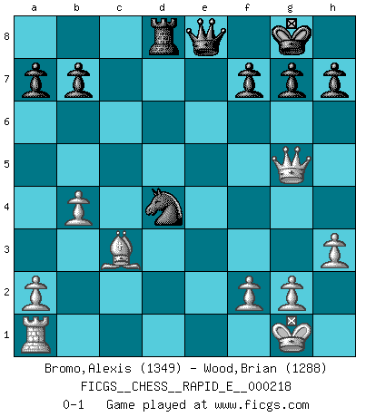Last move : 0-1 2018 December 23 2:34:6 [Event "FICGS__CHESS__RAPID_E__000218"] [Site "FICGS"] [Date "2018.09.27"] [Round "1"] [White "Bromo,Alexis"] [Black "Wood,Brian"] [Result "0-1"] [WhiteElo "1349"] [BlackElo "1288"] 1.d4 d5 2.c4 e6 3.Nc3 Nf6 4.e3 c5 5.Nf3 Nc6 6.Be2 cxd4 7.exd4 Bb4 8.Bd2 O-O 9.O-O dxc4 10.Bxc4 Bxc3 11.Bxc3 Nd5 12.Bxd5 exd5 13.Re1 Bg4 14.h3 Bxf3 15.Qxf3 Qd7 16.b4 Rfe8 17.Rxe8+ Qxe8 18.Qxd5 Rd8 19.Qg5 Nxd4 0-1 This chess game has been lost on time (started : 2018.09.27 3:35:40) QGD : 3...Nf6 Kingside Castling by player Black (move 8) Kingside Castling by player White (move 9) Player Black won this chess game. Follow this game move after move (download)The most powerful weapon in Chess is to have the next move. (David Bronstein) Ja, ich habe einmal eine Blitzpartie gespielt, es war in einem Zug, 1929. --im Interview 1989 (Mikhail Moiseyevich Botvinik) Dejen al perfeccionista jugar por correo. (Yasser Seirawan) Même si vous avez un bon coup à faire, regardez toujours s'il n'y en a pas un qui lui soit préférable. (Pedro Damiano) He who laughs last probably does not get the joke. (Unknown)