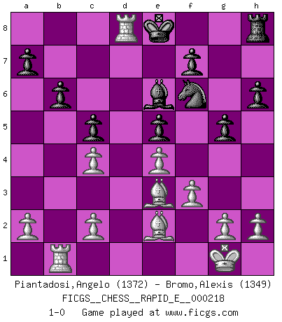 Last move : 1-0 2018 November 21 23:19:20 [Event "FICGS__CHESS__RAPID_E__000218"] [Site "FICGS"] [Date "2018.09.27"] [Round "1"] [White "Piantadosi,Angelo"] [Black "Bromo,Alexis"] [Result "1-0"] [WhiteElo "1372"] [BlackElo "1349"] 1.e4 e5 2.Nf3 Nc6 3.d4 d6 4.dxe5 Nxe5 5.Nxe5 dxe5 6.Qxd8+ Kxd8 7.Be3 Nf6 8.Nc3 Bb4 9.Bd3 Bxc3+ 10.bxc3 Be6 11.O-O h6 12.Rfd1 Ke8 13.Rab1 b6 14.c4 c5 15.f3 Rd8 16.Be2 g5 17.Rxd8+ 1-0 This chess game has been lost on time (started : 2018.09.27 3:35:40) Scotch Opening Kingside Castling by player White (move 11) Player White won this chess game. Follow this game move after move (download)Chess is like war on a board. (Bobby Fischer) Ich verstehe Aljechins Kombinationen ganz gut; aber woher er diese Angriffschancen bekommt und wie er die Eröffnung behandelt das ist für mich ein Buch mit sieben Siegeln. (Rudolf Spielmann) Yo considero que Fischer es uno de los expertos mas grandes de aperturas de siempre. (Keith Hayward) Demandez au pauvre Cg1 ce qu'il en pense. Eduard Gufeld à propos de la variante Saemisch de l'Est-Indienne. Chess is as much a mystery as women. (Purdy)