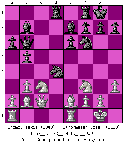 Last move : 0-1 2018 November 29 23:55:25 [Event "FICGS__CHESS__RAPID_E__000218"] [Site "FICGS"] [Date "2018.09.27"] [Round "1"] [White "Bromo,Alexis"] [Black "Strohmeier,Josef"] [Result "0-1"] [WhiteElo "1349"] [BlackElo "1150"] 1.d4 d5 2.c4 e6 3.Nc3 Nf6 4.Nf3 c5 5.e3 Nc6 6.Be2 Be7 7.O-O O-O 8.h3 a6 9.b3 dxc4 10.Bxc4 b5 11.Be2 Bb7 12.Bb2 cxd4 13.exd4 Qb6 14.Re1 Rad8 15.Qc2 Nxd4 0-1 This chess game has been lost on time (started : 2018.09.27 3:35:40) QGD : Semi-Tarrasch defense Kingside Castling by player White (move 7) Kingside Castling by player Black (move 7) Player Black won this chess game. Follow this game move after move (download)It is peculiar but a fact nevertheless, that gamblers in chess always have enthusiastic followers. (Botvinnik) Ich bin Weltmeister und muß mit niemandem irgend etwas diskutieren. (Viswanathan Anand) Las ideas audaces son como las piezas del Ajedrez que avanzan hacia adelante. Ellas pueden ser vencidas, pero también pueden iniciar una partida victoriosa. (Goethe) RxDa4 pat (...) Good decisions come from experience, and experience comes from bad decisions. (Anonymous)