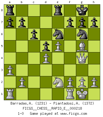 Last move : 1-0 2018 October 27 1:56:50 [Event "FICGS__CHESS__RAPID_E__000218"] [Site "FICGS"] [Date "2018.09.27"] [Round "1"] [White "Barradas,Anderson"] [Black "Piantadosi,Angelo"] [Result "1-0"] [WhiteElo "1231"] [BlackElo "1372"] 1.e4 e6 2.d4 d5 3.exd5 exd5 4.a3 Bd6 5.Nc3 c6 6.Nf3 Ne7 7.Qe2 O-O 8.Ne5 Re8 9.Qh5 Bxe5 10.dxe5 Bf5 11.Bd3 Bxd3 12.cxd3 Nd7 13.d4 Nf8 14.Qg4 Ne6 15.O-O Ng6 16.Ne2 Qg5 17.Bxg5 1-0 French : Exchange variation Kingside Castling by player Black (move 7) Kingside Castling by player White (move 15) Player White won this chess game. Follow this game move after move (download)There is only one thing Fischer does in Chess without pleasure: to lose ! (Boris Spassky) Ich habe Putins Aufstieg an die Macht beobachtet und seine Politik, die demokratischen Institutionen meines Landes zu zerstören. (Garry Kasparov) Juega la Apertura como un libro, el Juego Medio como un mago y los Finales como una máquina. (Spielmann) Celui qui prend des risques peut perdre, celui qui n'en prend pas perd toujours. (Xavier Tartacover) There are two kinds of tragedy in this world, one is not getting what you want and the other is getting. (Lord of war)