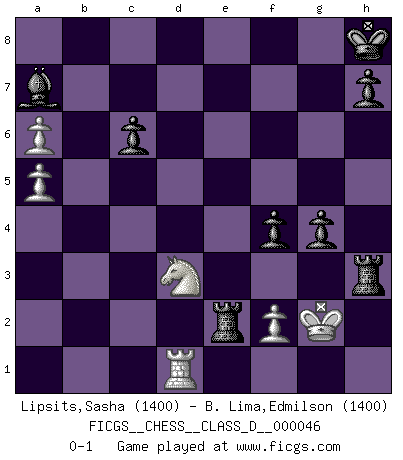 Last move : 0-1 2007 June 28 3:48:58 [Event "FICGS__CHESS__CLASS_D__000046"] [Site "FICGS"] [Date "2007.05.19"] [Round "1"] [White "Lipsits,Sasha"] [Black "B. Lima,Edmilson"] [Result "0-1"] [WhiteElo "1400"] [BlackElo "1400"] 1.e4 e5 2.Nf3 Nc6 3.Bb5 a6 4.Ba4 Nf6 5.O-O b5 6.Bb3 Bc5 7.a4 Rb8 8.c3 d6 9.d4 Bb6 10.Na3 b4 11.cxb4 Nxd4 12.Nxd4 Bxd4 13.Nc2 Ba7 14.Bc4 Qd7 15.Qe2 Qc6 16.b5 Qxe4 17.bxa6 Qxe2 18.Bxe2 O-O 19.Bb5 c6 20.Bd3 d5 21.b4 e4 22.Be2 d4 23.Bc4 d3 24.Ne3 Nd7 25.Bd2 Ne5 26.Rac1 Rd8 27.Rfd1 Rd6 28.h3 Rg6 29.Kh1 Rf6 30.Kg1 Kh8 31.Re1 Bxh3 32.a5 Rg6 33.Kh2 Bxg2 34.Nxg2 Nf3+ 35.Kh3 Nxd2 36.Red1 Nf3 37.Nf4 Rh6+ 38.Kg3 Rxb4 39.Bxd3 g5 40.Bxe4 Rxe4 41.Nd3 Nd4 42.Re1 Ne2+ 43.Kf3 f5 44.Rxe2 g4+ 45.Kg2 Rxe2 46.Rb1 Rh3 47.Rd1 f4 0-1 Ruy Lopez : 5.O-O Kingside Castling by player White (move 5) Kingside Castling by player Black (move 18) Player Black won this chess game. Follow this game move after move (download)Chess opens and enriches your mind. (Saudin Robovic) Zeige mir drei Eröffnungsvarianten und ich beweise dir, dass zwei davon inkorrekt sind. (Emanuel Lasker) Aunque la mayoría de la gente disfruta observar las partidas de los grandes Maestros de ataque, algunos de los jugadores mas notables en la historia han sido los jugadores silenciosos posicionales. Lentamente ellos te aplastan despojandote de tu espacio, congestionando tus piezas y dejandote virtualmente sin nada que hacer. (Yasser Seirawan) Il n'y a plus de joueurs du niveau de Jacob Murray dont la seule quête est le beau jeu, le plaisir de voir les pièces construire quelque chose. Sur 10 idées à la minute, 9 seront sans intérêt, la dernière s'avèrera géniale. (Christian Bauer) There are more things in heaven and earth than practically anywhere else. (Unknown)