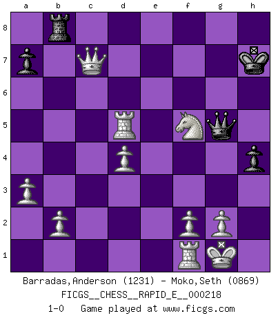 Last move : 1-0 2018 December 7 17:1:27 [Event "FICGS__CHESS__RAPID_E__000218"] [Site "FICGS"] [Date "2018.09.27"] [Round "1"] [White "Barradas,Anderson"] [Black "Moko,Seth"] [Result "1-0"] [WhiteElo "1231"] [BlackElo "0869"] 1.e4 c6 2.d4 d5 3.exd5 cxd5 4.c4 dxc4 5.Bxc4 Nf6 6.Nc3 Bf5 7.Nf3 e6 8.Ne5 Qa5 9.O-O Bd6 10.Bf4 O-O 11.Bd3 Bxd3 12.Qxd3 Nc6 13.Nxc6 bxc6 14.Bxd6 Nd5 15.Bxf8 Rxf8 16.a3 Nf4 17.Qc4 h5 18.h4 Qf5 19.Ne2 Nd5 20.Qxc6 Qg4 21.Qc4 g5 22.hxg5 Qxg5 23.Ng3 f5 24.Rae1 Re8 25.Rxe6 Rd8 26.Re5 h4 27.Nxf5 Kh7 28.Rxd5 Rb8 29.Qc7+ 1-0 Caro-Kann : Panov-Botvinnik attack Kingside Castling by player White (move 9) Kingside Castling by player Black (move 10) Player White won this chess game. Follow this game move after move (download)You have to have the fighting spirit. You have to force moves and take chances. (Bobby Fischer) Kleine Schachspieler machen Mist, und große Schachspieler machen Mist, aber große machen weniger Mist. (Fritz Sämisch) Cuando veas una buena jugada, trata de encontrar otra mejor. (Emanuel Lasker) Il vaut toujours mieux jouer un plan faux de façon logique que de n'avoir pas de plan du tout. (Victor Kortchnoï) There are two major products that came out of Berkeley: LSD and UNIX. We do not believe this is to be a coincidence. (Jeremy S. Anderson)