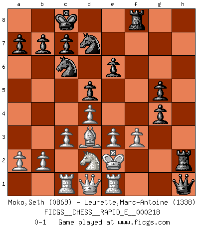 Last move : 0-1 2018 October 19 17:56:58 [Event "FICGS__CHESS__RAPID_E__000218"] [Site "FICGS"] [Date "2018.09.27"] [Round "1"] [White "Moko,Seth"] [Black "Leurette,Marc-Antoine"] [Result "0-1"] [WhiteElo "0869"] [BlackElo "1338"] 1.d4 d5 2.Bf4 e6 3.Nf3 Nf6 4.e3 Nc6 5.c3 Bd6 6.Bxd6 Qxd6 7.Bd3 Bd7 8.O-O O-O-O 9.Nbd2 g6 10.h3 h5 11.Re1 Nh7 12.Nb3 f5 13.Rc1 g5 14.g4 fxg4 15.hxg4 hxg4 16.Nfd2 Nf6 17.Nc5 Qh2+ 18.Kf1 Rdf8 19.Nxd7 Nxd7 20.f3 Qh1+ 21.Ke2 Rh2+ 0-1 Queen's pawn, Mason variation Kingside Castling by player White (move 8) Queenside Castling by player Black (move 8) Player Black won this chess game. Follow this game move after move (download)Combinations have always been the most intriguing aspect of Chess. The masters look for them, the public applauds them, the critics praise them. It is because combinations are possible that Chess is more than a lifeless mathematical exercise. They are the poetry of the game; they are to Chess what melody is to music. They represent the triumph of mind over matter. (Reuben Fine) Im Hotelzimmer gab es nur zwei Schaben. (Über die Turnierbedingungen) (Peter Swidler) Una buena memoria, concentración, imaginación y una fuerte voluntad, se requiere para llegar a ser un buen jugador. (Bobby Fischer) Les Echecs, c'est l'art de la guerre sans les charniers, c'est la résurrection des morts tombés au champ d'honneur, l'espoir perpétuel, la suprématie de l'intelligence sur la force, la culture de l'esprit. (F. Szpiner) Bobby never cared about money, though. His only desire was to prove that his choices were correct: He wanted chess to be important because he was a chess player, and he wanted to be important. Bobby knew money was important, but he didn't have a clue why, outside of clothes and status. The only way he could accomplish what he wanted was to fight for a lot of money. Once he got it, he gave it away. He did not know how to spend it. And once he'd become champion, after, essentially, sacrificing his life for it, he didn't know how to spend his time. (Bob Wade)