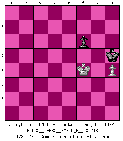 Last move : 1/2-1/2 2019 January 27 10:34:12 [Event "FICGS__CHESS__RAPID_E__000218"] [Site "FICGS"] [Date "2018.09.27"] [Round "1"] [White "Wood,Brian"] [Black "Piantadosi,Angelo"] [Result "1/2-1/2"] [WhiteElo "1288"] [BlackElo "1372"] 1.Nf3 d5 2.c4 e6 3.d4 Nf6 4.g3 Be7 5.Bg2 dxc4 6.Qa4+ Bd7 7.Qxc4 O-O 8.Ne5 c6 9.Nxd7 Nbxd7 10.Nc3 Rc8 11.O-O Nb6 12.Qd3 Nfd5 13.Nxd5 Nxd5 14.Rd1 Bf6 15.e4 Nc7 16.e5 Bg5 17.Bxg5 Qxg5 18.f4 Qg6 19.Qxg6 hxg6 20.a4 Rcd8 21.b4 Nd5 22.b5 cxb5 23.axb5 Ne3 24.Rd3 Nxg2 25.Kxg2 Rd5 26.Rb1 Rfd8 27.Rb4 b6 28.Ra3 Rxd4 29.Rxd4 Rxd4 30.Rxa7 Rd5 31.Ra8+ Kh7 32.Ra7 Rxb5 33.Rxf7 Rb2+ 34.Kh3 b5 35.Re7 b4 36.Rxe6 b3 37.Rb6 Rb1 38.g4 b2 39.f5 gxf5 40.gxf5 Re1 41.Rxb2 Rxe5 42.Rf2 Re4 43.Kg3 Ra4 44.h4 Kh6 45.f6 gxf6 46.Rf4 Rxf4 47.Kxf4 Kh5 1/2-1/2 Reti Opening Kingside Castling by player Black (move 7) Kingside Castling by player White (move 11) 10 pieces endgame at move 39 : White KRPPP , Black KRPPP WHITE : King + 1 Rook 3 Pawns BLACK : King + 1 Rook 3 Pawns 9 pieces endgame at move 40 : White KRPPP , Black KRPP WHITE : King + 1 Rook 3 Pawns BLACK : King + 1 Rook 2 Pawns 8 pieces endgame at move 41 : White KRPPP , Black KRP WHITE : King + 1 Rook 3 Pawns BLACK : King + 1 Rook 1 Pawn 7 pieces endgame at move 41 : White KRPP , Black KRP WHITE : King + 1 Rook 2 Pawns BLACK : King + 1 Rook 1 Pawn 6 pieces endgame at move 45 : White KRP , Black KRP WHITE : King + 1 Rook 1 Pawn BLACK : King + 1 Rook 1 Pawn 5 pieces endgame at move 46 : White KP , Black KRP WHITE : King + 1 Pawn BLACK : King + 1 Rook 1 Pawn 4 pieces endgame at move 47 : White KP , Black KP WHITE : King + 1 Pawn BLACK : King + 1 Pawn This chess game ended in a draw. Follow this game move after move (download)The boy (then a 12 year old boy named Anatoly Karpov) doesn't have a clue about Chess, and there's no future at all for him in this profession. (Mikhail Botvinnik) Bis jetzt ist Weiß einer wohlbekannten Analyse gefolgt. Aber jetzt begeht er einen schrecklichen Fehler: Er beginnt seinen eigenen Kopf zu benutzen. (Siegbert Tarrasch) Después de la respuesta de las negras a 1.e4 con 1..e5, se quedan siempre tratando de entrar dentro del juego. (Howard Staunton) Vous savez, camarade Pachman, je n'éprouve pas de plaisir à être ministre, je jouerais plutôt aux échecs comme vous, ou alors ferais une révolution au Venezuela. (Che Guevara à Ludek Pachman, 'Checkmate in Prague', 1975) Everybody lies. (Gregory House, House M.D.)