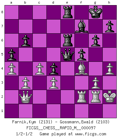 Last move : 1/2-1/2 2018 October 15 18:35:26 [Event "FICGS__CHESS__RAPID_M__000097"] [Site "FICGS"] [Date "2018.09.27"] [Round "1"] [White "Farnik,Kym"] [Black "Gossmann,Ewald"] [Result "1/2-1/2"] [WhiteElo "2131"] [BlackElo "2103"] 1.c4 c5 2.Nf3 Nf6 3.Nc3 Nc6 4.g3 e5 5.Bg2 d6 6.O-O Be7 7.b3 O-O 8.Bb2 Bg4 9.h3 Be6 10.Ng5 Bd7 11.Nge4 Nxe4 12.Nxe4 Be6 13.Nc3 Qd7 14.Kh2 f5 15.Nd5 Rae8 16.f4 Bf6 17.Nxf6+ Rxf6 18.e3 Bf7 19.a3 b6 20.Rc1 Rh6 21.Qc2 a5 22.h4 Rf6 23.Rf2 d5 24.Rcf1 g6 25.d3 d4 26.Bxc6 Rxc6 27.fxe5 Rxe5 28.exd4 cxd4 29.Bc1 Re8 30.Bh6 Rce6 31.Rg2 Qd6 32.Qb2 Qe5 33.Rf4 Rd6 34.R4f2 Rde6 35.a4 R8e7 36.Bg5 Re8 37.Bf4 1/2-1/2 English : Symmetrical variation Kingside Castling by player White (move 6) Kingside Castling by player Black (move 7) This chess game ended in a draw. Follow this game move after move (download)Help your pieces so they can help you. (Paul Morphy) Je mehr ich von der FIDE weiss, um so weniger verstehe ich. (Alexander Kalifman) Alguna parte de un error es siempre correcto. (Savielly Tartakover) Demandez au pauvre Cg1 ce qu'il en pense. Eduard Gufeld à propos de la variante Saemisch de l'Est-Indienne. Winning isn't everything... but losing is nothing. (Mednis)