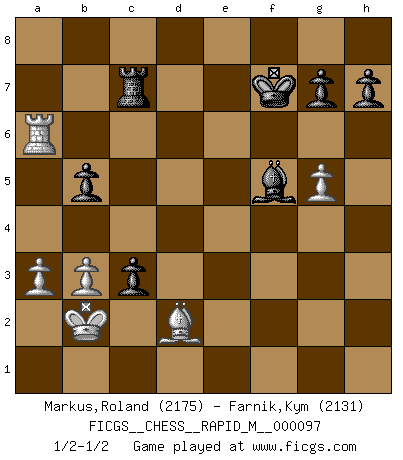 Last move : 1/2-1/2 2018 November 26 22:32:24 [Event "FICGS__CHESS__RAPID_M__000097"] [Site "FICGS"] [Date "2018.09.27"] [Round "1"] [White "Markus,Roland"] [Black "Farnik,Kym"] [Result "1/2-1/2"] [WhiteElo "2175"] [BlackElo "2131"] 1.e4 c5 2.Nf3 d6 3.d4 cxd4 4.Nxd4 Nf6 5.Nc3 a6 6.Be3 e5 7.Nb3 Be7 8.f3 Be6 9.Qd2 Nbd7 10.g4 O-O 11.O-O-O b5 12.g5 Nh5 13.Kb1 Nb6 14.Nd5 Nxd5 15.exd5 Bf5 16.Na5 f6 17.Nc6 Qd7 18.h4 fxg5 19.hxg5 Ng3 20.Rh2 Nxf1 21.Rxf1 Rae8 22.b3 Bd8 23.Kb2 Bg6 24.Rhf2 Qh3 25.Qe1 Qd7 26.Qb4 Rf5 27.Qd2 Bh5 28.a3 Bf7 29.f4 exf4 30.Rxf4 Rxf4 31.Bxf4 Qf5 32.Nxd8 Rxd8 33.Rf3 Bxd5 34.Rc3 Be4 35.Rc7 d5 36.Qd4 Rd7 37.Rc8+ Kf7 38.Qc5 Kg6 39.Rc6+ Kf7 40.Bd2 d4 41.Qxf5+ Bxf5 42.Rxa6 Rc7 43.c3 dxc3+ 1/2-1/2 Sicilian : Najdorf, Byrne (English) attack Kingside Castling by player Black (move 10) Queenside Castling by player White (move 11) This chess game ended in a draw. Follow this game move after move (download)Bobby is the most misunderstood, misquoted celebrity walking the face of this earth. (Yasser Seirawan) Ohne Fehler kann es keine Brillanz geben. (Emanuel Lasker) El Ajedrez es realmente noventa y nueve por ciento calculación. (Soltis) La vie et les Echecs sont tous les deux une lutte constante. (Lasker) Internet: Absolute communication, absolute isolation. (Paul Carvel)