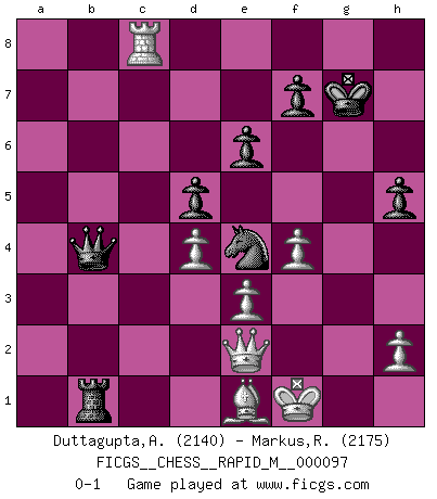 Last move : 0-1 2019 January 30 8:23:7 [Event "FICGS__CHESS__RAPID_M__000097"] [Site "FICGS"] [Date "2018.09.27"] [Round "1"] [White "Duttagupta,Aniruddha"] [Black "Markus,Roland"] [Result "0-1"] [WhiteElo "2140"] [BlackElo "2175"] 1.d4 Nf6 2.c4 e6 3.Nf3 d5 4.g3 Bb4+ 5.Bd2 Be7 6.Bg2 O-O 7.O-O c6 8.Qc2 b6 9.Bf4 Nbd7 10.Rd1 Bb7 11.Ne5 Nh5 12.Bd2 Nhf6 13.cxd5 cxd5 14.Nc6 Bxc6 15.Qxc6 Rc8 16.Qb5 Ne8 17.Qd3 Ndf6 18.Nc3 Nd6 19.b3 Qd7 20.f3 Nf5 21.e3 Rfd8 22.Ne2 h5 23.Be1 g5 24.Bf2 g4 25.Nf4 Nd6 26.a4 Bf8 27.Be1 Bh6 28.a5 Rc7 29.axb6 axb6 30.Ra6 Ra7 31.Rxb6 Rda8 32.Rc1 Ra1 33.Qd2 Bxf4 34.gxf4 R8a2 35.Rxa1 Rxa1 36.Rb4 Qc8 37.Ra4 Rb1 38.Ra2 gxf3 39.Bxf3 Nfe4 40.Bxe4 Nxe4 41.Qg2+ Kh7 42.Qe2 Kh6 43.Kf1 Qc3 44.b4 Qb3 45.Rc2 Qxb4 46.Rc8 Kg7 0-1 Queen's pawn game Kingside Castling by player Black (move 6) Kingside Castling by player White (move 7) Player Black won this chess game. Follow this game move after move (download)Who is your opponent tonight, tonight I am playing against the Black pieces. (Akiba Rubinstein) Bogoljubow: Matt in vier Zügen! Tartakower: Ich verbitte mir jede Belästigung! (Savielly Grigorievitsch Tartakower) a manera como él juega al Ajedrez, demuestra la completa naturaleza de un hombre. (Stanley Ellin) Les échecs sont plus proches de l'art de l'assassinat que de l'art de la guerre. (Arturo Perez-Reverte) Whoever said the pen is mightier than the sword obviously never encountered automatic weapons. (US General Douglas MacArthur)
