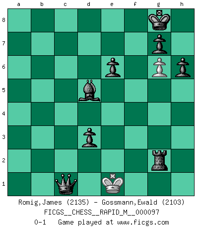 Last move : 0-1 2018 December 28 3:38:36 [Event "FICGS__CHESS__RAPID_M__000097"] [Site "FICGS"] [Date "2018.09.27"] [Round "1"] [White "Romig,James"] [Black "Gossmann,Ewald"] [Result "0-1"] [WhiteElo "2135"] [BlackElo "2103"] 1.e4 e6 2.d4 d5 3.Nc3 Bb4 4.e5 c5 5.a3 Bxc3+ 6.bxc3 Ne7 7.Qg4 O-O 8.Bd3 Nbc6 9.Nf3 f5 10.Qg3 Qa5 11.Be2 Qxc3+ 12.Bd2 Qxa1+ 13.Bd1 Qxa3 14.dxc5 f4 15.Bxf4 Qb4+ 16.Bd2 Qe4+ 17.Be2 Qxc2 18.Qg5 d4 19.Bc1 d3 20.Bd1 Qxc5 21.O-O a5 22.Ne1 Rd8 23.Nf3 a4 24.Be3 Qd5 25.Nd2 Qxe5 26.Qxe5 Nxe5 27.Re1 b5 28.Bg5 N5g6 29.Bh5 h6 30.Be3 Bb7 31.Bxg6 Nxg6 32.Ra1 b4 33.f3 b3 34.Rb1 Bd5 35.Bd4 a3 36.h4 a2 37.Re1 Rac8 38.h5 Rc2 39.hxg6 Rxd2 40.f4 Rxg2+ 41.Kf1 Rf8 42.Be3 b2 43.Bd2 b1Q 44.Bc1 Rxf4+ 45.Bxf4 Qxe1+ 46.Kxe1 a1Q+ 47.Bc1 Qxc1+ 0-1 French : Winawer, Advance, poisoned pawn variation Kingside Castling by player Black (move 7) Kingside Castling by player White (move 21) Promotion Queen by player Black (move 43) Promotion Queen by player Black (move 46) 10 pieces endgame at move 47 : White KP , Black KQRBPPPP WHITE : King + 1 Pawn BLACK : King + 1 Queen 1 Rook 1 Bishop 4 Pawns Player Black won this chess game. Follow this game move after move (download)Chess is like life. (Boris Spassky) Es tut gut, die Entwicklungsperiode von, [...] demokratischem Geist durchdringen zu lassen. Wie undemokratisch wäre es doch beispielsweise, den einen Offizier große Spaziertouren vornehmen zu lassen, während die anderen zu Hause säßen und sich entsetzlich langweilten. (Aaron Nimzowitsch) La vida es como el Ajedrez, con lucha, competición y eventos buenos y malos. (Benjamin Franklin) On entre au jeu d'Echecs comme on entre en Religion. Pour le joueur d'Echecs, la partie d'Echecs c'est l'office, la messe, le défilé du 1er Mai, le dépôt de gerbe au Monument aux Morts. C'est un drame sacré. (Michel Roos) To err is human, to shift the blame on someone else is tactical. (Mladen Jankovic)