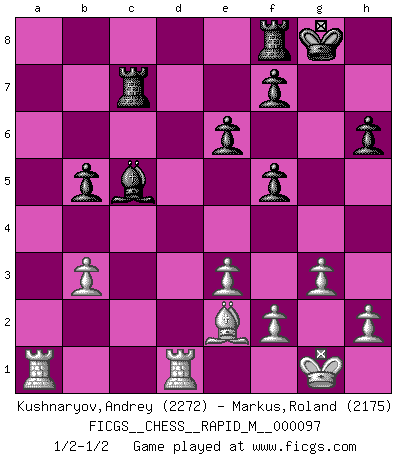 Last move : 1/2-1/2 2018 November 22 13:32:15 [Event "FICGS__CHESS__RAPID_M__000097"] [Site "FICGS"] [Date "2018.09.27"] [Round "1"] [White "Kushnaryov,Andrey"] [Black "Markus,Roland"] [Result "1/2-1/2"] [WhiteElo "2272"] [BlackElo "2175"] 1.Nf3 Nf6 2.d4 d5 3.g3 c6 4.c4 dxc4 5.Bg2 b5 6.O-O e6 7.Ne5 Bb7 8.b3 cxb3 9.axb3 Be7 10.Nc3 Qb6 11.Bg5 h6 12.Bxf6 gxf6 13.Nd3 Nd7 14.Qc2 Qxd4 15.Nxb5 cxb5 16.Bxb7 Rb8 17.Bf3 O-O 18.Qa2 Nc5 19.Rfd1 Rbc8 20.Nxc5 Qxc5 21.Qxa7 Rc7 22.Qxc5 Bxc5 23.e3 f5 24.Be2 1/2-1/2 Reti Opening Kingside Castling by player White (move 6) Kingside Castling by player Black (move 17) This chess game ended in a draw. Follow this game move after move (download)A strong memory, concentration, imagination, and a strong will is required to become a great Chess player. (Bobby Fischer) Frage: Was machen Sie mit den Preisen? Anwort: Ich habe Angst, dass meine Freundin davon neue Kleider kauft. (Loek van Wely) Solo existe una cosa que Fischer hace en el Ajedrez sin placer: ¡perder!. (Boris Spassky) On peut tirer plus d'utilité d'une partie perdue que de 100 parties gagnées. (Capablanca) If only faces could talk... (Pat Summerall, Sportscaster during the Super Bowl)