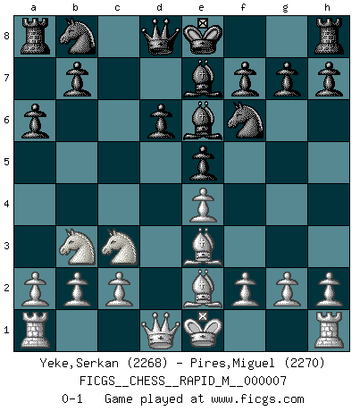 Last move : 0-1 2007 July 29 13:18:2 [Event "FICGS__CHESS__RAPID_M__000007"] [Site "FICGS"] [Date "2007.05.20"] [Round "1"] [White "Yeke,Serkan"] [Black "Pires,Miguel"] [Result "0-1"] [WhiteElo "2268"] [BlackElo "2270"] 1.e4 c5 2.Nf3 d6 3.d4 cxd4 4.Nxd4 Nf6 5.Nc3 a6 6.Be2 e5 7.Nb3 Be7 8.Be3 Be6 0-1 This chess game has been lost on time (started : 2007.05.20 22:54:43) Sicilian : Najdorf, Opovcensky variation Player Black won this chess game. Follow this game move after move (download)When asked, -How is that you pick better moves than your opponents?, I responded: I'm very glad you asked me that, because, as it happens, there is a very simple answer. I think up my own moves, and I make my opponent think up his. (Alexander Alekhine) Der Umstand, daß uns eine 7 Stunden Zeitkontrolle ermöglicht eine großartige, tiefe Partie zu spielen, ist für die Massenmedien nicht weiter von Bedeutung. (Alexej Shirov) El Ajedrez es el arte del análisis. (Mikhail Botvinnik) Vous n'êtes pas toujours obligé de jouer le meilleur coup. Un coup doit être actif, entreprenant, correct et beau ! (David Bronstein) Whatever you do, don't be bored. This is absolutely the most exciting time we could have possibly hoped to be alive. And things are just starting. (From movie Waking life)