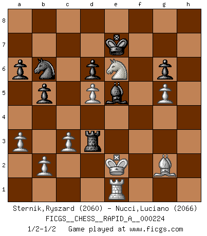 Last move : 1/2-1/2 2018 December 15 19:44:37 [Event "FICGS__CHESS__RAPID_A__000224"] [Site "FICGS"] [Date "2018.09.27"] [Round "1"] [White "Sternik,Ryszard"] [Black "Nucci,Luciano"] [Result "1/2-1/2"] [WhiteElo "2060"] [BlackElo "2066"] 1.e4 c5 2.Nf3 d6 3.d4 cxd4 4.Nxd4 Nf6 5.Nc3 a6 6.Be3 e6 7.a3 b5 8.g4 Bb7 9.Bg2 Nfd7 10.f4 Nc5 11.g5 Nbd7 12.O-O Nb6 13.f5 Nc4 14.fxe6 Nxe3 15.Qh5 g6 16.exf7+ Ke7 17.Qf3 Nxf1 18.Nd5+ Bxd5 19.exd5 Kd7 20.Rxf1 Bg7 21.Ne6 Qb6 22.Qe3 Be5 23.f8Q Raxf8 24.Nxf8+ Ke7 25.Ne6 Nd7 26.Qxb6 Nxb6 27.c3 h6 28.h4 hxg5 29.hxg5 Rh4 30.Re1 Rg4 31.Kf1 Rg3 32.Kf2 Rd3 33.Ke2 Rg3 34.Kf2 Rd3 35.Ke2 1/2-1/2 Sicilian : Najdorf, Byrne (English) attack Kingside Castling by player White (move 12) Promotion Queen by player White (move 23) This chess game ended in a draw. Follow this game move after move (download)Chess books should be used as we use glasses: to assist the sight, although some players make use of them as if they thought they conferred sight. (Jose Raul Capablanca) Im Schach nämlich geht es darum, daß Ich des Gegners klein zu kriegen, sein Ego zu zerbrechen und zu zermahlen, seine Selbstachtung zu zertreten und zu verscharren und seine ganze mißachtenswerte sogenannte Persönlichkeit ein für alle Mal tot zu hacken und zu zerstampfen und dadurch die menschliche Gesellschaft von einer stinkenden Pestbeule zu befreien. Es ist ein königliches Spiel. (Robert James Fischer) La pasion por jugar al Ajedrez es una de las mas inexplicables en el mundo. (H.G. Wells) Je fais ceci parce que dans cinquante coups j'obtiendrai cela; je m'appelle Mikhail Moisevitch Botvinnik. (Botvinnik) Whoever said the pen is mightier than the sword obviously never encountered automatic weapons. (US General Douglas MacArthur)