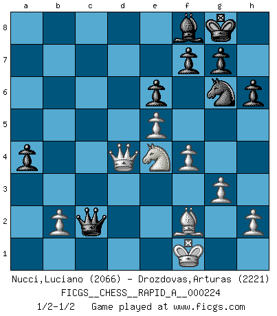 Last move : 1/2-1/2 2018 November 8 23:30:46 [Event "FICGS__CHESS__RAPID_A__000224"] [Site "FICGS"] [Date "2018.09.27"] [Round "1"] [White "Nucci,Luciano"] [Black "Drozdovas,Arturas"] [Result "1/2-1/2"] [WhiteElo "2066"] [BlackElo "2221"] 1.d4 d5 2.c4 e6 3.Nf3 Nf6 4.g3 Be7 5.Bg2 O-O 6.O-O dxc4 7.Qc2 a6 8.a4 Bd7 9.Rd1 Bc6 10.Nc3 Bxf3 11.Bxf3 Nc6 12.Bxc6 bxc6 13.a5 Rb8 14.Ra4 Rb4 15.Na2 Rxa4 16.Qxa4 Qd5 17.Nc3 Qh5 18.Qxc6 Qxa5 19.Qxc4 c5 20.dxc5 Bxc5 21.Bf4 Qb6 22.e3 Be7 23.Qe2 h6 24.e4 Rd8 25.Rxd8+ Bxd8 26.Qd2 Be7 27.e5 Nh7 28.Be3 Qb7 29.f4 Nf8 30.Qg2 Qb3 31.Qe2 a5 32.Ne4 a4 33.Bd4 Qd5 34.Qd3 Bb4 35.Kf2 Ng6 36.Ke2 Qc6 37.Bf2 Qc1 38.Qd4 Qc2+ 39.Kf1 Bf8 1/2-1/2 Queen's gambit declined Kingside Castling by player Black (move 5) Kingside Castling by player White (move 6) This chess game ended in a draw. Follow this game move after move (download)There are tough players and nice guys, and I'm a tough player. (Bobby Fischer) Jeder leidlich begabte Spieler, er braucht keineswegs hervorragend veranlagt zu sein, kann es zum Meister bringen. Aber das ist ja auch gar nicht nötig! Der richtige Standpunkt ist es, zu seinem Vergnügen zu spielen, und man glaube ja nicht, dass der Genuss proportional dem Können sei. (Siegbert Tarrasch) Yo nunca en mi vida he jugado la Defensa Francesa, que viene siendo la más aburrida de todas las Aperturas. (Wilhelm Steinitz) Les échecs, c'est l'imagination. (David Bronstein) Computer Science is no more about computers than astronomy is about telescopes. (Edsger W. Dijkstra)