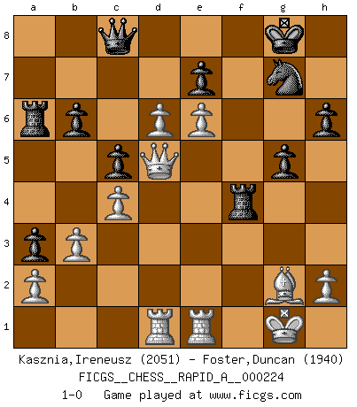 Last move : 1-0 2018 November 20 17:31:17 [Event "FICGS__CHESS__RAPID_A__000224"] [Site "FICGS"] [Date "2018.09.27"] [Round "1"] [White "Kasznia,Ireneusz"] [Black "Foster,Duncan"] [Result "1-0"] [WhiteElo "2051"] [BlackElo "1940"] 1.Nf3 d6 2.g3 g6 3.Bg2 Bg7 4.O-O f5 5.d4 Nf6 6.c4 O-O 7.Nc3 Qe8 8.d5 a5 9.Re1 Na6 10.Be3 Bd7 11.Bd4 Nc5 12.Bxc5 dxc5 13.Ne5 a4 14.Qc2 a3 15.b3 Ng4 16.Nxd7 Qxd7 17.e3 Ne5 18.Rad1 Nf7 19.Ne2 g5 20.f4 h6 21.Nc1 Nd6 22.Nd3 Ra5 23.Qd2 b6 24.Ne5 Bxe5 25.fxe5 Ne8 26.e4 f4 27.e6 Qc8 28.gxf4 Rxf4 29.e5 Ng7 30.d6 cxd6 31.exd6 Ra6 32.Qd5 1-0 Reti Opening Kingside Castling by player White (move 4) Kingside Castling by player Black (move 6) Player White won this chess game. Follow this game move after move (download)Bobby is the finest Chess player this country ever produced. His memory for the moves, his brilliance in dreaming up combinations, and his fierce determination to win are uncanny. (John Collins) Die Fehler sind da, Sie warten nur darauf gemacht zu werden. (Savielly Grigorievitsch Tartakower) La vida es como un juego de Ajedrez, cambiando con cada movimiento. (Proverbio Chino) Soyez une menace à chaque fois que vous vous asseyez pour jouer. (Ken Smith) Chess is as much a mystery as women. (Purdy)