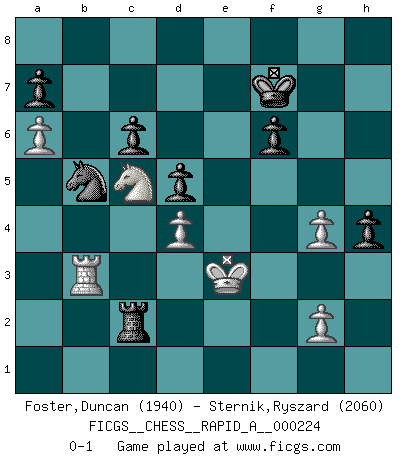 Last move : 0-1 2019 January 10 18:15:34 [Event "FICGS__CHESS__RAPID_A__000224"] [Site "FICGS"] [Date "2018.09.27"] [Round "1"] [White "Foster,Duncan"] [Black "Sternik,Ryszard"] [Result "0-1"] [WhiteElo "1940"] [BlackElo "2060"] 1.e4 c5 2.a3 Nc6 3.b4 e6 4.Nf3 d5 5.exd5 exd5 6.Bb5 Nf6 7.O-O Be6 8.Re1 Be7 9.bxc5 Bxc5 10.d4 Bb6 11.Bg5 h6 12.Bh4 g5 13.Bg3 O-O 14.Bxc6 bxc6 15.Nbd2 Re8 16.a4 Rc8 17.Nb3 Ne4 18.a5 Bc7 19.Bxc7 Rxc7 20.Ne5 Bf5 21.f3 Nd6 22.Nc5 Rce7 23.Qd2 Qc8 24.h3 Kg7 25.a6 Nb5 26.Re3 f6 27.Ng4 Bxg4 28.Rxe7+ Rxe7 29.hxg4 Qe8 30.Ra4 Re2 31.Qd3 Re1+ 32.Kf2 Rh1 33.Qd2 h5 34.Rb4 hxg4 35.fxg4 Qh8 36.Rb3 Kf7 37.Qd3 Qh4+ 38.Qg3 Rc1 39.Qxh4 Rxc2+ 40.Ke3 gxh4 0-1 Sicilian defense Kingside Castling by player White (move 7) Kingside Castling by player Black (move 13) Player Black won this chess game. Follow this game move after move (download)In Chess, as it is played by masters, chance is practically eliminated. (Emanuel Lasker) Ich bin der einzige Schachspieler, der sich während der Vorbereitungen zum Turnier verletzt hat. (Woody Allen) Nada excita más a Grandes Maestros aburridos que una novedad teórica. (Dominic Lawson) Le succès, c'est être capable d'aller d'échec en échec sans perdre son enthousiasme. (Winston Churchill) When you have everything, sometimes it feels like nothing. (Horatio Caine, C.S.I. Miami)