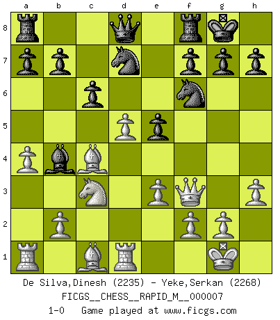 Last move : 1-0 2007 August 9 20:50:4 [Event "FICGS__CHESS__RAPID_M__000007"] [Site "FICGS"] [Date "2007.05.20"] [Round "1"] [White "De Silva,Dinesh"] [Black "Yeke,Serkan"] [Result "1-0"] [WhiteElo "2235"] [BlackElo "2268"] 1.d4 d5 2.c4 c6 3.Nf3 Nf6 4.Nc3 dxc4 5.a4 Bf5 6.e3 e6 7.Bxc4 Bb4 8.O-O Nbd7 9.Qe2 Bg4 10.h3 Bxf3 11.Qxf3 O-O 12.Rd1 e5 13.d5 1-0 This chess game has been lost on time (started : 2007.05.20 22:54:43) QGD Slav : Dutch variation Kingside Castling by player White (move 8) Kingside Castling by player Black (move 11) Player White won this chess game. Follow this game move after move (download)Bobby is the finest Chess player this country ever produced. His memory for the moves, his brilliance in dreaming up combinations, and his fierce determination to win are uncanny. (John Collins) Schach ist Kampf, hauptsächlich jedoch gegen die eigenen Fehler. (Savielly Grigorievitsch Tartakower) Con el fin de mejorar tu juego, debes de estudiar los finales antes que todo, ya que mientras que los finales pueden ser estudiados y dominados por sí mismos, el juegomedio y la apertura deben de ser estudiados en relación con los finales. (José Raúl Capablanca) Mais n'est-ce pas déjà le limiter injurieusement que d'appeler les échecs un jeu? N'est-ce pas aussi une science, un art, ou quelque chose qui, comme le cercueil de Mahomet entre ciel et terre, est suspendu entre l'un et l'autre, et qui réunit un nombre incroyable de contraires ? (Stefan Zweig) Treat your password like your toothbrush. Don't let anybody else use it, and get a new one every six months. (Clifford Stoll)
