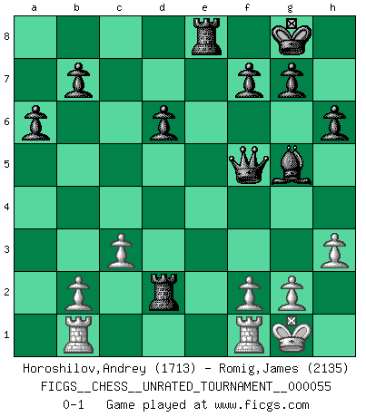 Last move : 0-1 2018 October 31 4:44:25 [Event "FICGS__CHESS__UNRATED_TOURNAMENT__000055"] [Site "FICGS"] [Date "2018.09.27"] [Round "1"] [White "Horoshilov,Andrey"] [Black "Romig,James"] [Result "0-1"] [WhiteElo "1713"] [BlackElo "2135"] 1.e4 c5 2.Nf3 d6 3.d4 cxd4 4.Nxd4 Nf6 5.Nc3 a6 6.Bd3 e5 7.Nf3 Be7 8.Bg5 Be6 9.Qe2 Qc7 10.O-O O-O 11.h3 h6 12.Bxf6 Bxf6 13.a4 Nd7 14.Rac1 Qb6 15.Rb1 Qb4 16.Nd2 Bg5 17.Nc4 Rac8 18.Nd5 Bxd5 19.exd5 Nf6 20.a5 e4 21.Bxe4 Nxe4 22.Qxe4 Rxc4 23.Qd3 Rd4 24.Qf3 Qxa5 25.c3 Rxd5 26.Ra1 Qb5 27.Rab1 Rd3 28.Qe2 Re8 29.Qc2 Rd2 30.Qf5 Qxf5 0-1 Sicilian : Najdorf Kingside Castling by player White (move 10) Kingside Castling by player Black (move 10) Player Black won this chess game. Follow this game move after move (download)A Chess game is divided into three stages: the first, when you hope you have the advantage, the second when you believe you have an advantage, and the third... when you know you're going to lose ! (Savielly Tartakower) Schach ist eine Sache der genauen Beurteilung, wann man zuschlagen und wann man sich ducken muss. (Robert James Fischer) ¿Esta Bobby Fischer algo cuerdo?. (Salo Flohr) La tactique, c'est ce que vous faites quand il y a quelque chose à faire; la stratégie, c'est ce que vous faites quand il n'y a rien à faire. (Savielli Tartacower) Games, world of games... There's always an opponent, and there's always a victim. (Revolver, movie)