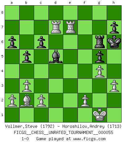 Last move : 1-0 2018 October 22 15:15:8 [Event "FICGS__CHESS__UNRATED_TOURNAMENT__000055"] [Site "FICGS"] [Date "2018.09.27"] [Round "1"] [White "Vollmer,Steve"] [Black "Horoshilov,Andrey"] [Result "1-0"] [WhiteElo "1792"] [BlackElo "1713"] 1.e4 e5 2.Nf3 Nc6 3.Bb5 f6 4.d4 a6 5.Ba4 b5 6.Bb3 Na5 7.Bxg8 Rxg8 8.dxe5 Be7 9.Qd5 Kf8 10.Qxa8 Nc4 11.Qd5 c6 12.Qd1 fxe5 13.O-O d6 14.Nbd2 Nb6 15.b3 g6 16.Bb2 g5 17.Nxe5 dxe5 18.Bxe5 Nd7 19.Bb2 Ke8 20.Qh5+ Kf8 21.e5 Rg7 22.Ne4 Qe8 23.Qxe8+ Kxe8 24.e6 Nf6 25.Nxf6+ Bxf6 26.Bxf6 Rg6 27.Bb2 Bxe6 28.Rfe1 Kd7 29.Rad1+ Ke7 30.Ba3+ Kf7 31.Rd6 Bd5 32.Rd7+ Kf6 33.Bb2+ Kf5 34.Re5+ Kg4 35.h3+ Kh5 36.g4+ Kh6 37.R5e7 1-0 Ruy Lopez : Nuernberg variation Kingside Castling by player White (move 13) Player White won this chess game. Follow this game move after move (download)Good offense and good defense both begin with good development. (Bruce A. Moon) Wenn Du absolut nicht mehr weißt, was Du tun sollst, dann ist es Zeit für Panik. (John van der Wiel) El Ajedrez es tan interesante por sí solo, que no es necesario un interés monetario para persuadir a una persona a que lo practique; por lo tanto, nunca se juega por dinero. (Benjamin Franklin) Il n'y a pas de prix trop élevé au scalp de l'ennemi. (Koblentz) Creativity is allowing yourself to make mistakes. Art is knowing which ones to keep. (Scott Adams)