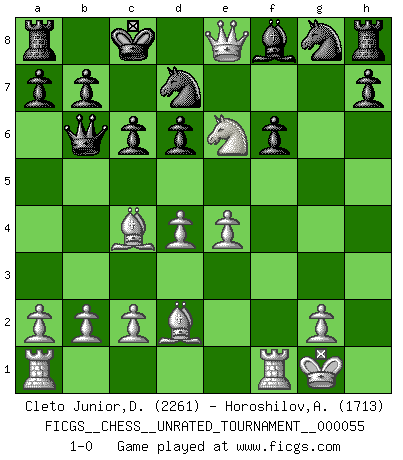 Last move : 1-0 2018 October 31 4:44:51 [Event "FICGS__CHESS__UNRATED_TOURNAMENT__000055"] [Site "FICGS"] [Date "2018.09.27"] [Round "1"] [White "Cleto Junior,Dirceu"] [Black "Horoshilov,Andrey"] [Result "1-0"] [WhiteElo "2261"] [BlackElo "1713"] 1.e4 e5 2.f4 exf4 3.Nf3 d6 4.d4 g5 5.h4 Bg4 6.hxg5 Bxf3 7.Qxf3 Qxg5 8.Bxf4 Qa5+ 9.Bd2 Qb6 10.Nc3 c6 11.Bc4 Qc7 12.O-O f6 13.Ne2 Nd7 14.Qh5+ Ke7 15.Qf7+ Kd8 16.Nf4 Qb6 17.Ne6+ Kc8 18.Qe8+ 1-0 KGA : Fischer defense Kingside Castling by player White (move 12) Player White won this chess game. Follow this game move after move (download)There is only one thing Fischer does in Chess without pleasure: to lose ! (Boris Spassky) Unter Putin wird alles Geld aus Russland wie von einem Staubsauger nach Moskau umgeleitet, das ist wie ein schwarzes Loch. (Garry Kasparov) Cuando tengas duda... ¡juega al Ajedrez!. (Tevis) Les Cavaliers se révèlent fort utiles dans les positions fermées. D'habitude, les Fous sont un peu plus forts que les Cavaliers dans les positions ouvertes. Qu'on le veuille ou non, il restera toujours des exceptions ! Luck is when opportunity knocks and you answer. (Anonymous)