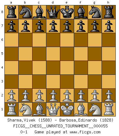Last move : 0-1 2018 November 6 22:1:47 [Event "FICGS__CHESS__UNRATED_TOURNAMENT__000055"] [Site "FICGS"] [Date "2018.09.27"] [Round "1"] [White "Sharma,Vivek"] [Black "Barbosa,Edinardo"] [Result "0-1"] [WhiteElo "1588"] [BlackElo "1828"] 0-1 This chess game has been lost on time (started : 2018.09.27 20:43:29) Player Black won this chess game. Follow this game move after move (download)When you play Bobby, it is not a question if you win or lose. It is a question if you survive. (Boris Spassky) Der Freibauer hat für mich eine Seele, genau wie der Mensch, Wünsche, die unerkannt in ihm schlummern, und Befürchtungen, von deren Existenz er selbst kaum ahnt. (Aaron Nimzowitsch) El jugador táctico debe saber que hacer cuando algo se debe de hacer. El estratégico debe saber que hacer cuando nada se debe de hacer. (Savielly Tartakover) Il (Jacob Murray) ne joue pas pour le bon coup, mais pour le meilleur. (Eloi Relange) The intuitive mind is a sacred gift; the rational mind is a faithful servant. We have created a society that honors the servant but has forgotten the gift. (Albert Einstein)