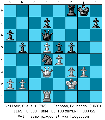 Last move : 0-1 2018 November 3 13:2:34 [Event "FICGS__CHESS__UNRATED_TOURNAMENT__000055"] [Site "FICGS"] [Date "2018.09.27"] [Round "1"] [White "Vollmer,Steve"] [Black "Barbosa,Edinardo"] [Result "0-1"] [WhiteElo "1792"] [BlackElo "1828"] 1.e4 c5 2.Nf3 e6 3.d4 cxd4 4.Nxd4 a6 5.Nc3 Bc5 6.Be3 Qc7 7.Be2 Nf6 8.f3 b6 9.O-O e5 10.Nf5 g6 11.Nd5 Nxd5 12.Qxd5 Bb7 13.Qb3 gxf5 14.Bxc5 Qxc5+ 15.Kh1 f4 16.Rad1 O-O 17.Bc4 b5 18.Bd5 Nc6 19.c4 Nd4 20.Qd3 Bxd5 21.cxd5 Rac8 22.g3 fxg3 23.hxg3 Qd6 24.Kg2 Rc2+ 25.Rf2 Rxf2+ 26.Kxf2 f5 0-1 Sicilian : Kan, 5.Nc3 Kingside Castling by player White (move 9) Kingside Castling by player Black (move 16) Player Black won this chess game. Follow this game move after move (download)Fischer was a master of clarity and a king of artful positioning. His opponents would see where he was going but were powerless to stop him. (Bruce Pandolfini) Ein Buch ist ein Spiegel; wenn ein Affe hineinsieht, so kann kein Apostel heraus gucken. (Georg Christoph Lichtenberg) El Ajedrez es en su esencia, un juego. En su forma, un arte. Y en su ejecución, una ciencia. (Baron Tassilo) Comme les marins qui ont mille raisons différentes d'aller en mer, les joueurs d'échecs en ont tout autant avant de s'installer devant une table et jouer... (Vincent Bertignac, philosophe) A woman without a man is like a fish without a bicycle. (Gloria Steinem)