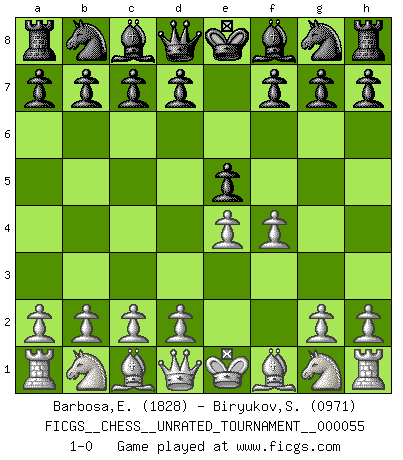 Last move : 1-0 2018 November 7 22:9:12 [Event "FICGS__CHESS__UNRATED_TOURNAMENT__000055"] [Site "FICGS"] [Date "2018.09.27"] [Round "1"] [White "Barbosa,Edinardo"] [Black "Biryukov,Sergey"] [Result "1-0"] [WhiteElo "1828"] [BlackElo "0971"] 1.e4 e5 2.f4 1-0 This chess game has been lost on time (started : 2018.09.27 20:43:29) King's gambit Player White won this chess game. Follow this game move after move (download)In complicated positions, Bobby Fischer hardly had to be afraid of anybody. (Paul Keres) Wer nie einen Fehler gemacht hat, hat nie etwas Neues ausprobiert. (Albert Einstein) Aquel que ve no otra dirección en el juego que la de dar Jaque Mate a su oponente, nunca será un buen jugador de Ajedrez. (Euwe) Horreur, mais aussi harmonie suprême : qu'y avait-il en effet au monde en dehors des échecs ? Le brouillard, l'inconnu, le non-être... (Vladimir Nabokov) Lamb in skin of tiger, still fears the wolf. (Chinese proverb)
