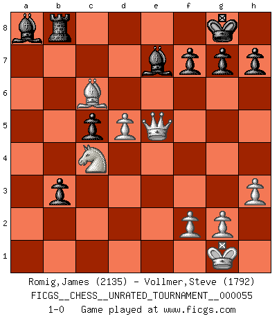 Last move : 1-0 2018 October 6 0:33:39 [Event "FICGS__CHESS__UNRATED_TOURNAMENT__000055"] [Site "FICGS"] [Date "2018.09.27"] [Round "1"] [White "Romig,James"] [Black "Vollmer,Steve"] [Result "1-0"] [WhiteElo "2135"] [BlackElo "1792"] 1.e4 e5 2.Nf3 Nc6 3.Bb5 a6 4.Ba4 Nf6 5.O-O b5 6.Bb3 Be7 7.Re1 O-O 8.c3 d6 9.h3 Na5 10.Bc2 c5 11.d4 Nc6 12.d5 Nb8 13.a4 Bb7 14.axb5 axb5 15.Rxa8 Bxa8 16.Qe2 b4 17.cxb4 cxb4 18.Bd2 Qb6 19.Be3 Qa5 20.Nfd2 Nbd7 21.Nb3 Qa2 22.N1d2 Qxb2 23.Nc4 Qc3 24.Rc1 Nxe4 25.Bxe4 Qxb3 26.Bc2 Qc3 27.Ba4 Qxc1+ 28.Bxc1 Nc5 29.Bc6 b3 30.Ba3 Rb8 31.Bxc5 dxc5 32.Qxe5 1-0 Ruy Lopez : 5.O-O Kingside Castling by player White (move 5) Kingside Castling by player Black (move 7) Player White won this chess game. Follow this game move after move (download)I'd rather have a Pawn than a finger. (Reuben Fine) Ich habe die besten Aussichten, den ersten Preis zu gewinnen - denn jeder muss gegen Steinitz spielen, nur ich nicht! (Wilhelm Steinitz) Aquel que toma al Peón de Caballo de la Reina, se pasará la noche a dormir en la calle. (Anónimo) J'apprécie les joueurs d'est-indienne, c'est grâce à eux que je nourris ma famille depuis tant d'années. (Petrosian) I just play for fun. (Anna Kournikova)