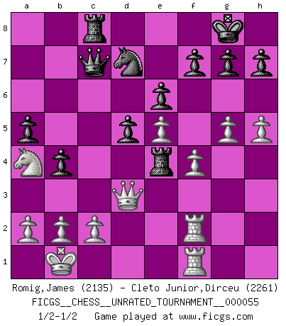 Last move : 1/2-1/2 2018 October 1 9:0:19 [Event "FICGS__CHESS__UNRATED_TOURNAMENT__000055"] [Site "FICGS"] [Date "2018.09.27"] [Round "1"] [White "Romig,James"] [Black "Cleto Junior,Dirceu"] [Result "1/2-1/2"] [WhiteElo "2135"] [BlackElo "2261"] 1.e4 e6 2.d4 d5 3.Nc3 Nf6 4.e5 Nfd7 5.f4 c5 6.Nf3 Nc6 7.Be3 cxd4 8.Nxd4 Bc5 9.Qd2 O-O 10.O-O-O a6 11.h4 Nxd4 12.Bxd4 b5 13.Rh3 b4 14.Na4 Bxd4 15.Qxd4 a5 16.h5 Qc7 17.g4 Ba6 18.g5 Bxf1 19.Rxf1 Ra6 20.Kb1 Rc6 21.Qd3 Rc4 22.Rhf3 Rc8 23.R3f2 Re4 1/2-1/2 French : Steinitz, Boleslavsky variation Kingside Castling by player Black (move 9) Queenside Castling by player White (move 10) This chess game ended in a draw. Follow this game move after move (download)Everything is in a state of flux, and this includes the world of Chess. (Mikhail Botvinnik) Bobby Fischer ist kein Vorbild für die heutige Jugend. (Viktor Kortschnoi) El Ajedrez demanda una total concentración. (Bobby Fischer) Les pièces de l'échiquier étaient impitoyables. Elles le retenaient, elles l'absorbaient. Il y avait de l'horreur en cela, mais aussi une harmonie unique. Car, qu'y a-t-il dans le monde, à part les échecs ? (V. Nabokov) The quality of decision is like the well-timed swoop of a falcon which enables it to strike and destroy its victim. (Sun Tzu)