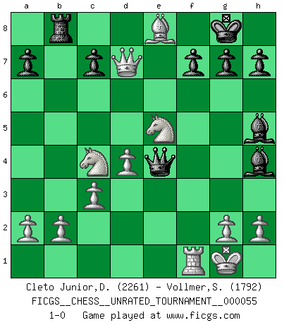 Last move : 1-0 2018 November 18 10:42:43 [Event "FICGS__CHESS__UNRATED_TOURNAMENT__000055"] [Site "FICGS"] [Date "2018.09.27"] [Round "1"] [White "Cleto Junior,Dirceu"] [Black "Vollmer,Steve"] [Result "1-0"] [WhiteElo "2261"] [BlackElo "1792"] 1.e4 e5 2.f4 exf4 3.Nf3 d6 4.d4 Be7 5.Bxf4 Nf6 6.Bd3 Nc6 7.O-O O-O 8.c3 Bg4 9.Nbd2 Qd7 10.Qb3 Bh5 11.Rae1 Rfe8 12.Qxb7 Rab8 13.Qa6 Rb6 14.Qa4 d5 15.exd5 Nxd5 16.Nc4 R6b8 17.Be4 Nxf4 18.Bxc6 Qg4 19.Nfe5 Qg5 20.Rxf4 Qxf4 21.Bxe8 Bh4 22.Rf1 Qe4 23.Qd7 1-0 KGA : Fischer defense Kingside Castling by player White (move 7) Kingside Castling by player Black (move 7) Player White won this chess game. Follow this game move after move (download)Not only will I predict his triumph over Botvinnik, but I'll go further and say that he'll probably be the greatest Chess player that ever lived. (John Collins) Das typische an einem Großmeister ist, daß er eine gewonnene Position schnell und schmerzlos gewinnt. (Irving Chernev) Alekhine es un poeta que crea un trabajo de arte de algo que raramente inspiraría a otra persona a mandar una tarjeta postal. (Max Euwe) Le moment que je préfère le plus dans une rencontre, c'est celui où je sens que la personnalité de l'adversaire se brise. (Robert Fischer) Who needs drugs and alcohol if he can play Big Chess at FICGS ? (Heinz-Georg Lehnhoff)
