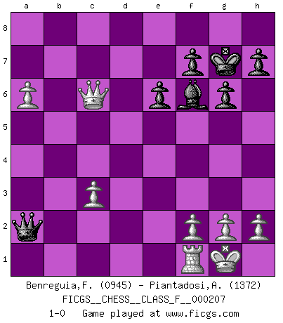 Last move : 1-0 2018 November 1 4:46:39 [Event "FICGS__CHESS__CLASS_F__000207"] [Site "FICGS"] [Date "2018.09.28"] [Round "1"] [White "Benreguia,Frederic"] [Black "Piantadosi,Angelo"] [Result "1-0"] [WhiteElo "0945"] [BlackElo "1372"] 1.d4 d5 2.Nc3 Nf6 3.Bg5 e6 4.e4 dxe4 5.Nxe4 Be7 6.Bb5+ Bd7 7.Nxf6+ Bxf6 8.Bxd7+ Nxd7 9.Bf4 O-O 10.c3 c5 11.Bd6 Re8 12.dxc5 Rc8 13.Qa4 Nxc5 14.Bxc5 Rxc5 15.Qxa7 Re5+ 16.Ne2 Qd3 17.O-O Qxe2 18.Qxb7 Rg5 19.a4 g6 20.a5 Rb5 21.Qc6 Rxb2 22.a6 Ra2 23.Qxe8+ Kg7 24.Rxa2 Qxa2 25.Qc6 1-0 Richter-Veresov attack Kingside Castling by player Black (move 9) Kingside Castling by player White (move 17) Player White won this chess game. Follow this game move after move (download)If cunning alone were needed to excel, women would be the best Chess players. (Albin) Es gibt nur zwei wahre Schachgenies - das andere war Wilhelm Steinitz, der Weltmeister von 1872 bis 1894. (Robert James Fischer) Hasta este punto, las blancas han seguido un análisis bien conocido. Pero ahora el hace un error fatal: empieza a usar su propia cabeza. (Siegbert Tarrasch) Le pion, dans sa simplicité, marche droit devant lui, mais lorsqu'il prend, il le fait obliquement? Ainsi l'homme, tant qu'il reste pauvre, marche dans la droiture et vit honnêtement, mais lorsqu'il recherche les honneurs, il flatte, se parjure et, par les voies obliques, cherche une position supérieure sur l'échiquier du monde. (Jean de Galles) I teach you to lie, cheat and steal, and as soon as my back's turned you wait in line ? (Gregory House, House M.D.)