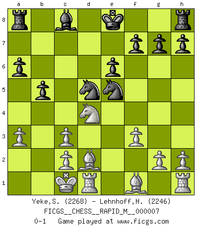 Last move : 0-1 2007 July 23 6:22:18 [Event "FICGS__CHESS__RAPID_M__000007"] [Site "FICGS"] [Date "2007.05.20"] [Round "1"] [White "Yeke,Serkan"] [Black "Lehnhoff,Heinz-Georg"] [Result "0-1"] [WhiteElo "2268"] [BlackElo "2246"] 1.e4 c5 2.Nf3 e6 3.d4 cxd4 4.Nxd4 Nc6 5.Nc3 Qc7 6.Be3 a6 7.Qd2 Nf6 8.O-O-O Bb4 9.f3 Ne5 10.a3 Bxc3 11.Qxc3 Qxc3 12.bxc3 d5 13.exd5 Nxd5 14.Bd2 b5 0-1 This chess game has been lost on time (started : 2007.05.20 22:54:43) Sicilian : Taimanov variation Queenside Castling by player White (move 8) Player Black won this chess game. Follow this game move after move (download)First-class players lose to second class players because second-class players sometimes play a first-class game. (Tarrasch) Die FIDE ist dabei in die Hände der russischen Mafia zu fallen. (Larry Evans) No es tiempo de jugar al Ajedrez cuando la casa esta en llamas. (Proverbio Italiano) Nous vivons dans un monde échiquéen : chaque jour qui passe est un défi à relever. (Philosophe Sasha) Don't be discouraged. It's often the last key in the bunch that opens the lock. (Author unknown)