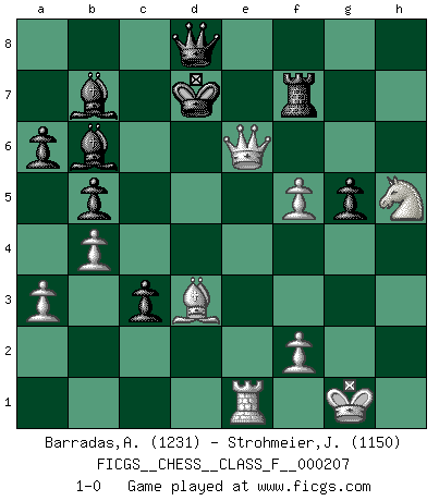 Last move : 1-0 2019 February 10 11:1:26 [Event "FICGS__CHESS__CLASS_F__000207"] [Site "FICGS"] [Date "2018.09.28"] [Round "1"] [White "Barradas,Anderson"] [Black "Strohmeier,Josef"] [Result "1-0"] [WhiteElo "1231"] [BlackElo "1150"] 1.e4 c5 2.Nf3 Nc6 3.d4 cxd4 4.Nxd4 Nf6 5.Nc3 e6 6.Bg5 Be7 7.Bb5 O-O 8.O-O h6 9.Bh4 a6 10.Be2 b5 11.e5 Nxe5 12.Bxf6 Bxf6 13.Ne4 d5 14.Ng3 Qb6 15.c3 Bb7 16.Qc1 Rac8 17.Nh5 Be7 18.Qe3 Ng6 19.Rac1 Qc7 20.Nf3 Bc5 21.Qd3 Ne5 22.Nxe5 Qxe5 23.Rce1 Qg5 24.g3 Rcd8 25.h4 Qe7 26.b4 Bb6 27.a3 Rc8 28.Qf3 d4 29.Qg4 g6 30.Bd3 g5 31.hxg5 hxg5 32.Re5 f5 33.Qe2 Rce8 34.g4 dxc3 35.gxf5 Qd8 36.Rxe6 Rxe6 37.Qxe6+ Rf7 38.Qg6+ Kf8 39.Qh6+ Ke8 40.Re1+ Kd7 41.Qe6+ 1-0 Sicilian defense Kingside Castling by player Black (move 7) Kingside Castling by player White (move 8) Player White won this chess game. Follow this game move after move (download)All I want to do, ever, is just play Chess. (Bobby Fischer) Ich habe die Schachforschung dermaßen betrieben, dass sie auf eine wissenschaftliche Basis gestellt wurde. (Mikhail Moiseyevich Botvinik) Cuando tu casa esta en llamas, no puedes ser molestado por tus vecinos. O, como decinos en Ajedrez, si tu Rey esta bajo ataque, no te preocupa perder un Peón del lado de la Reina. (Gary Kasparov) Nous sommes les pions de la mystérieuse partie d'Echecs jouée par Dieu. Il nous déplace, nous arrête, nous pousse encore, puis nous lance un à un dans la boîte du Néant. Epitaphe sur la tombe de David Janowsky (1868-1927). Hardware: the parts of a computer that can be kicked. (Jeff Persis)