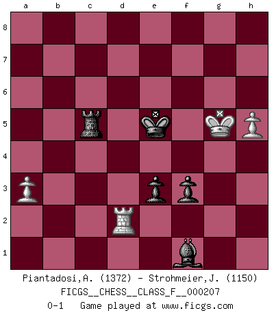 Last move : 0-1 2019 February 24 0:38:6 [Event "FICGS__CHESS__CLASS_F__000207"] [Site "FICGS"] [Date "2018.09.28"] [Round "1"] [White "Piantadosi,Angelo"] [Black "Strohmeier,Josef"] [Result "0-1"] [WhiteElo "1372"] [BlackElo "1150"] 1.e4 c5 2.Nf3 Nc6 3.d4 cxd4 4.Nxd4 Nf6 5.Nc3 e6 6.Be2 Bb4 7.Nxc6 bxc6 8.Bf3 Bxc3+ 9.bxc3 d5 10.Ba3 Qa5 11.Bb4 Qc7 12.O-O Bb7 13.Rb1 a5 14.Bc5 dxe4 15.Be2 Rd8 16.Qc1 Rd5 17.Bd4 e5 18.Be3 O-O 19.Bc4 Rd7 20.Rd1 Nd5 21.Bxd5 cxd5 22.Bb6 Qxc3 23.Rb3 Qc6 24.Bxa5 Qc4 25.Qb2 Bc6 26.Qxe5 Qxc2 27.Rdb1 Rb7 28.Rxb7 Bxb7 29.Qb2 Qxb2 30.Rxb2 Ba6 31.Rd2 Bc4 32.a3 Rc8 33.h3 f5 34.Kh2 Ra8 35.Bb4 Rd8 36.Rd4 Kf7 37.g3 Ke6 38.Kg2 g5 39.Kg1 h5 40.Kh2 f4 41.gxf4 gxf4 42.Kg2 Rg8+ 43.Kh2 f3 44.Rd2 Rg2+ 45.Kh1 Be2 46.Bc5 Rg8 47.Kh2 Rb8 48.Kg3 Bf1 49.Kh4 Rc8 50.Kxh5 Rxc5 51.h4 Ke5 52.Kg5 d4 53.h5 e3 54.fxe3 dxe3 0-1 Sicilian defense Kingside Castling by player White (move 12) Kingside Castling by player Black (move 18) 10 pieces endgame at move 54 : White KRPPP , Black KRBPP WHITE : King + 1 Rook 3 Pawns BLACK : King + 1 Rook 1 Bishop 2 Pawns 9 pieces endgame at move 54 : White KRPP , Black KRBPP WHITE : King + 1 Rook 2 Pawns BLACK : King + 1 Rook 1 Bishop 2 Pawns Player Black won this chess game. Follow this game move after move (download)When you see a good move, look for a better one. (Emanuel Lasker) Mutter, ich bin eben Ex-Weltmeister geworden. --beim nach Hause Kommen nach dem Verlust des WM-Titels an Mihail Botvinnik -- (Mikhail Nekhemyevich Tal) Cuando estes solo, cuando te sientas un extraño en el mundo, juega al Ajedrez. Esto levantará tu espiritu y será tu consejero de guerra. (Aristóteles) Une platitude souvent récitée à propos des Echecs est qu'une des choses les plus difficiles à réaliser est de gagner une position gagnante. Cela ne manque pas de sens mais, pour ma part, j'ai toujours trouvé plus difficile de gagner une position perdante. (Tim Krabbe) Go and wake up your luck. (Persian saying)