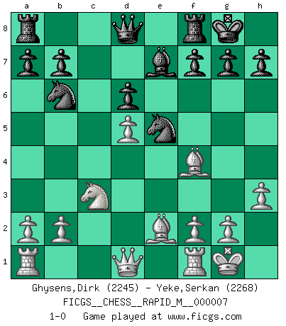 Last move : 1-0 2007 July 6 16:2:36 [Event "FICGS__CHESS__RAPID_M__000007"] [Site "FICGS"] [Date "2007.05.20"] [Round "1"] [White "Ghysens,Dirk"] [Black "Yeke,Serkan"] [Result "1-0"] [WhiteElo "2245"] [BlackElo "2268"] 1.e4 Nf6 2.e5 Nd5 3.d4 d6 4.Nf3 Bg4 5.Be2 e6 6.O-O Be7 7.c4 Nb6 8.h3 Bh5 9.exd6 cxd6 10.Nc3 O-O 11.Bf4 Nc6 12.d5 exd5 13.cxd5 Bxf3 14.Bxf3 Ne5 15.Be2 1-0 This chess game has been lost on time (started : 2007.05.20 22:54:43) Alekhine's defense : Modern variation, 4...Bg4 Kingside Castling by player White (move 6) Kingside Castling by player Black (move 10) Player White won this chess game. Follow this game move after move (download)Fischer Chess play was always razor-sharp, rational and brilliant. One of the best ever. (Dave Regis) Offener Brief an US-Präsident Bush anlässlich der Verhaftung Bobby Fishers: Verhaften Sie mich. Stecken Sie mich in dieselbe Zelle wie Bobby Fisher und geben Sie uns ein Schachspiel mit. (Boris Vassilievich Spassky) Morphy probablemente fue el genio más grande de todos. (Bobby Fischer) L'attaque fait le spectacle, la défense gagne les matchs. (Dicton footballistique) It's not enough to succeed. Others must fail. (Gore Vidal)