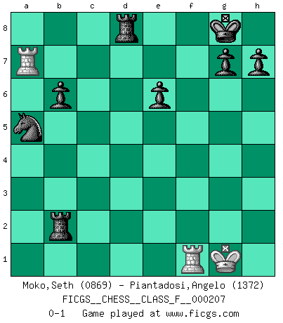 Last move : 0-1 2019 February 14 8:31:13 [Event "FICGS__CHESS__CLASS_F__000207"] [Site "FICGS"] [Date "2018.09.28"] [Round "1"] [White "Moko,Seth"] [Black "Piantadosi,Angelo"] [Result "0-1"] [WhiteElo "0869"] [BlackElo "1372"] 1.d4 d5 2.Bf4 e6 3.Nf3 c5 4.c3 Nc6 5.e3 Bd6 6.Bxd6 Qxd6 7.Bd3 Nf6 8.O-O O-O 9.Nbd2 b6 10.h3 Bb7 11.e4 dxe4 12.Nxe4 Nxe4 13.Bxe4 Na5 14.Ng5 Bxe4 15.Nxe4 Qf4 16.Ng3 cxd4 17.cxd4 Rfd8 18.Qc2 Qxd4 19.Ne2 Qd2 20.Qxd2 Rxd2 21.Nf4 Rxb2 22.Nd3 Rd2 23.f4 Rxd3 24.Rac1 Rad8 25.g4 Rxh3 26.f5 Rg3+ 27.Kh2 Rxg4 28.fxe6 fxe6 29.Rc7 Ra4 30.Rxa7 Rxa2+ 31.Kg1 Rb2 0-1 Queen's pawn, Mason variation Kingside Castling by player White (move 8) Kingside Castling by player Black (move 8) Player Black won this chess game. Follow this game move after move (download)Human affairs are like a Chess game: only those who do not take it seriously can be called good players. (Hung Tzu Ch'eng) Die unerbitterlichsten Regeln im Schach sind die Ausnahmen. (Savielly Grigorievitsch Tartakower) Las piezas de Ajedrez son los bloques del alfabeto que moldean los pensamientos; y esos pensamientos, aunque hagan un diseño visual en el tablero, expresan abstractamente su belleza como un poema. (Marcel Duchamp) Tout change constamment, y compris dans le monde des Echecs. (Botvinnik) Faith : not wanting to know what is true. (Friedrich Nietzsche)
